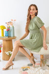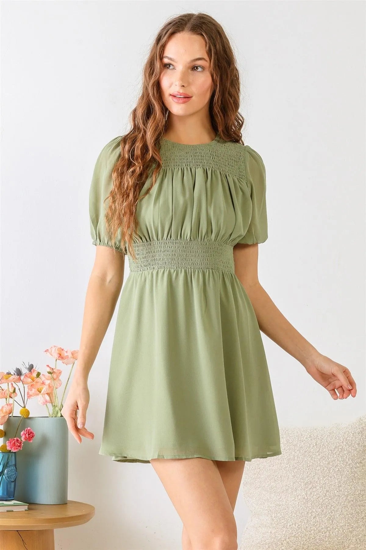 Sage Smocked Chiffon Puff Short Sleeve Flare Hem Mini Dress /3-2-1