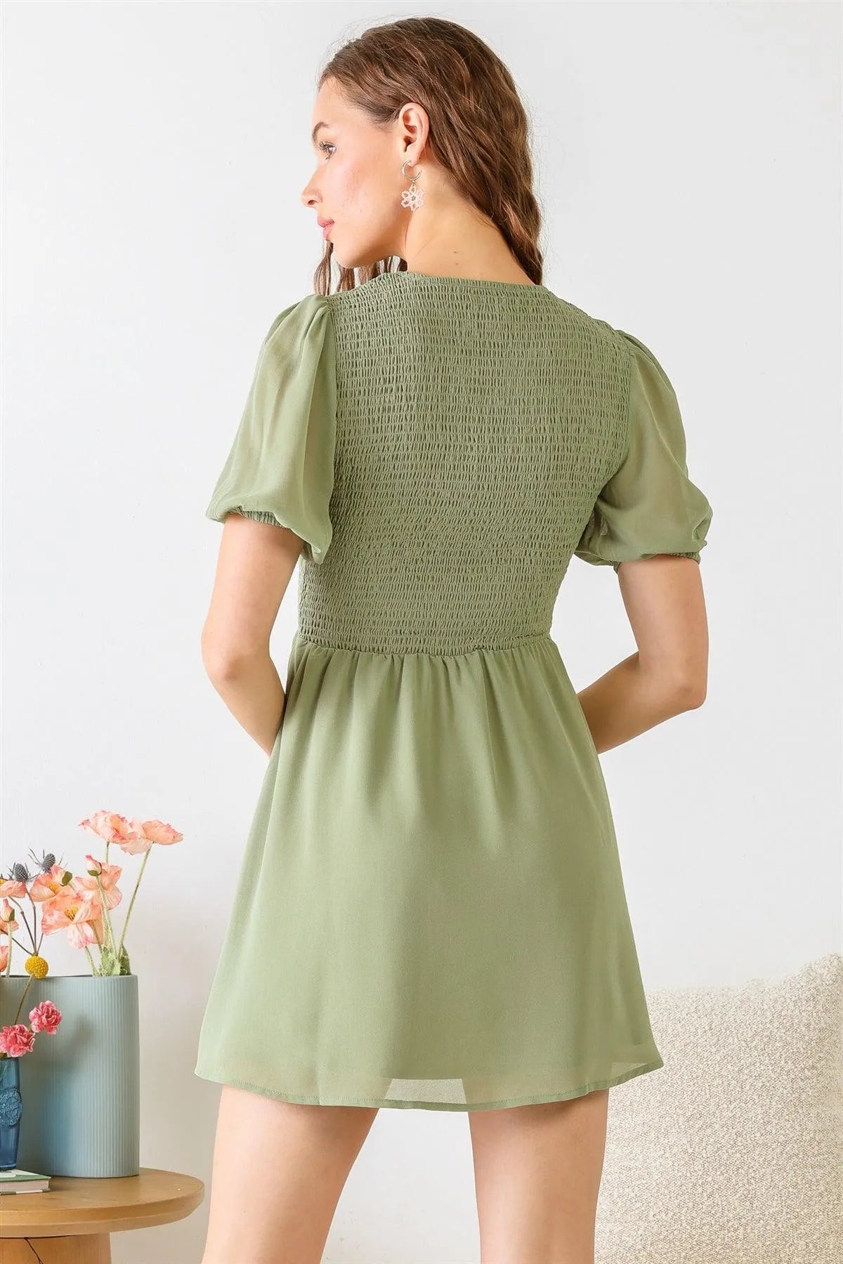 🖤 Item Features: Sage, solid color, chiffon material, smocked, crew neckline, puff short sleeves, flare hem, mini length, semi-stretchy, lined, non-sheer, casual, cute, lifestyle, must-have, summer vibe