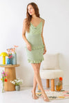 Women dress: Sage, solid color, smocked, ruffles, cowl neck, self-tie straps, sleeveless, mini length, semi-stretchy, unlined, not see through, stylish cut dress for perfect vacation!