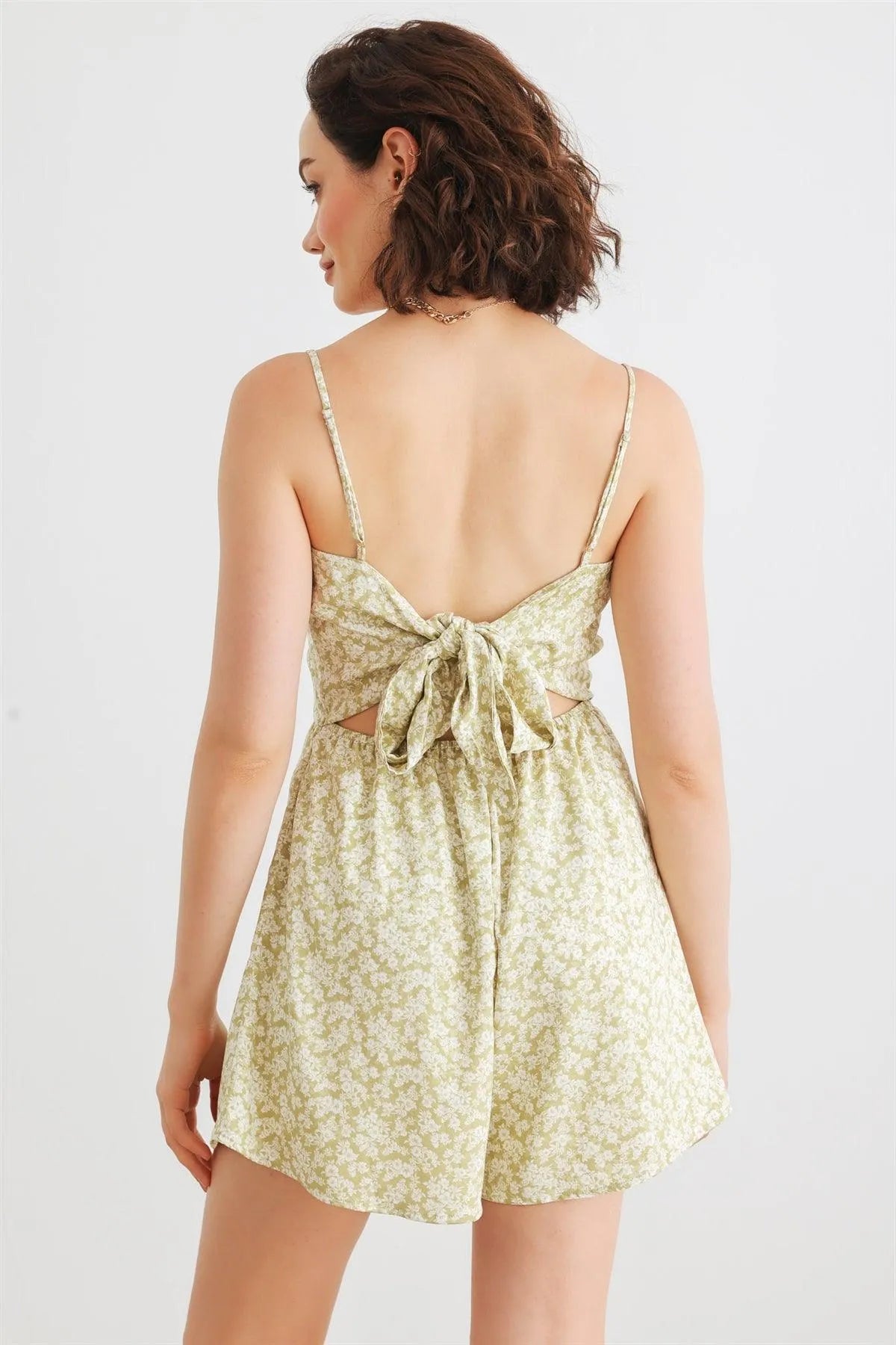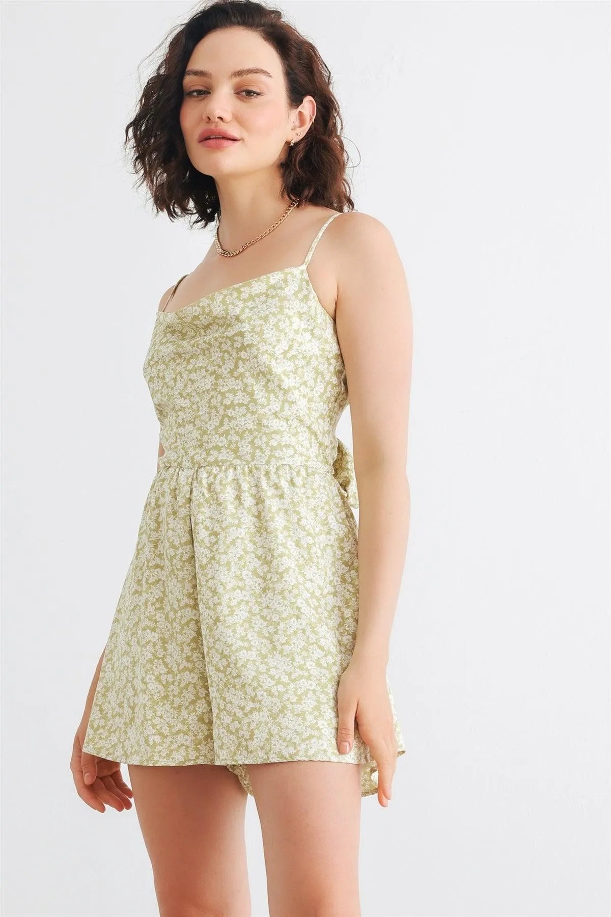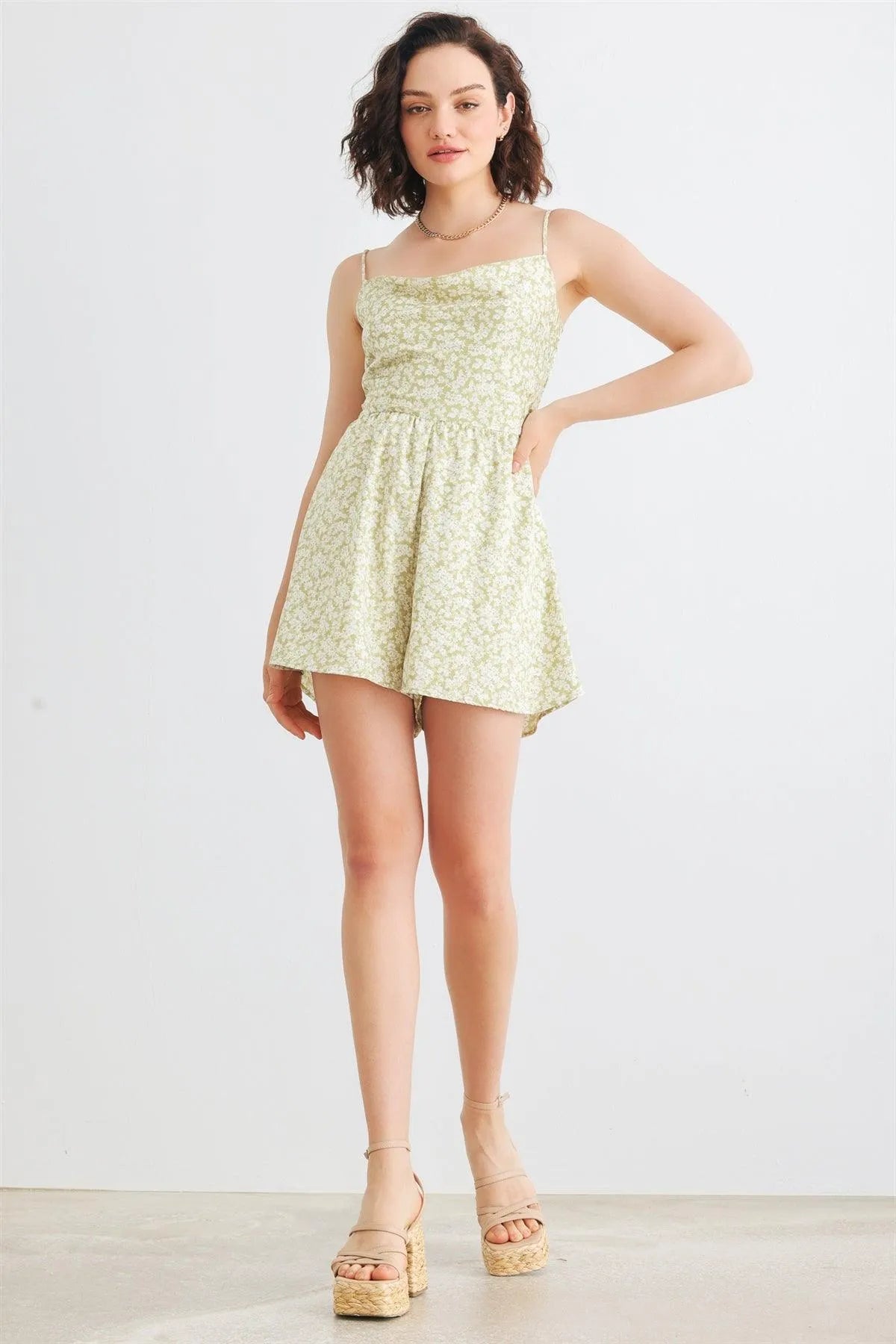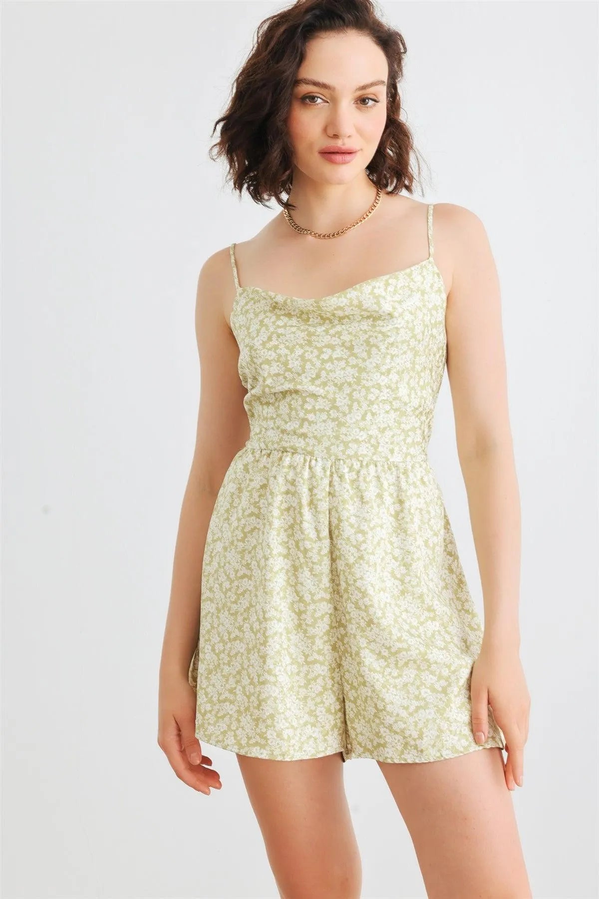 Sage & White Floral Satin Cowl Neck Tie Back Sleeveless Romper /4-2-1