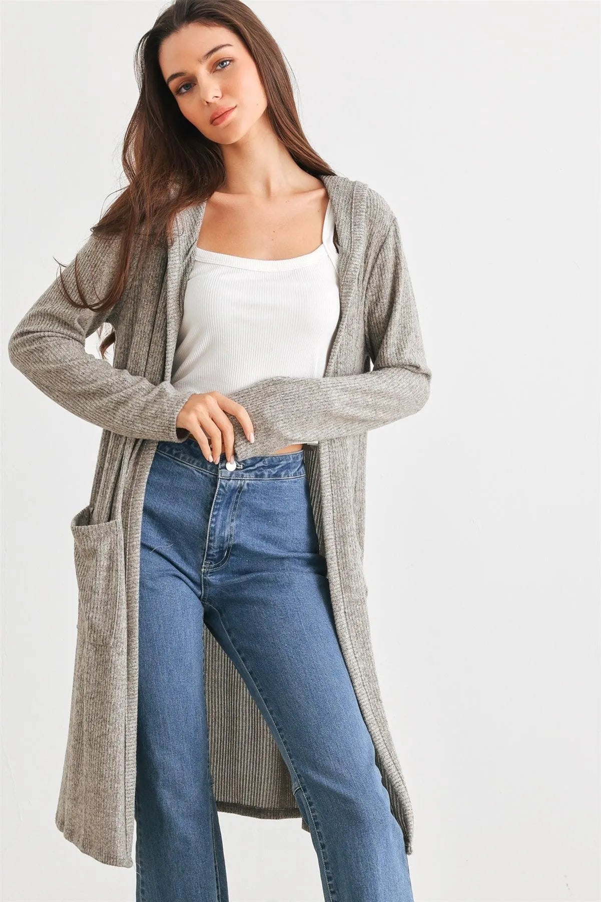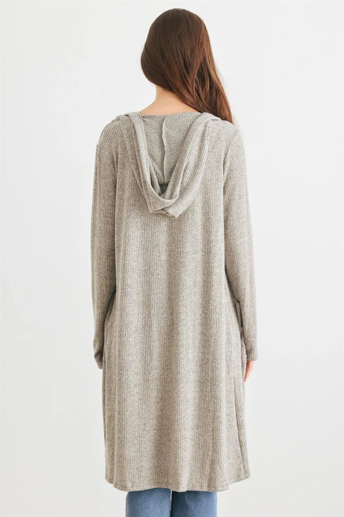 Sand Ribbed Two Pocket Open Front Hooded Cardigan /3-2-2