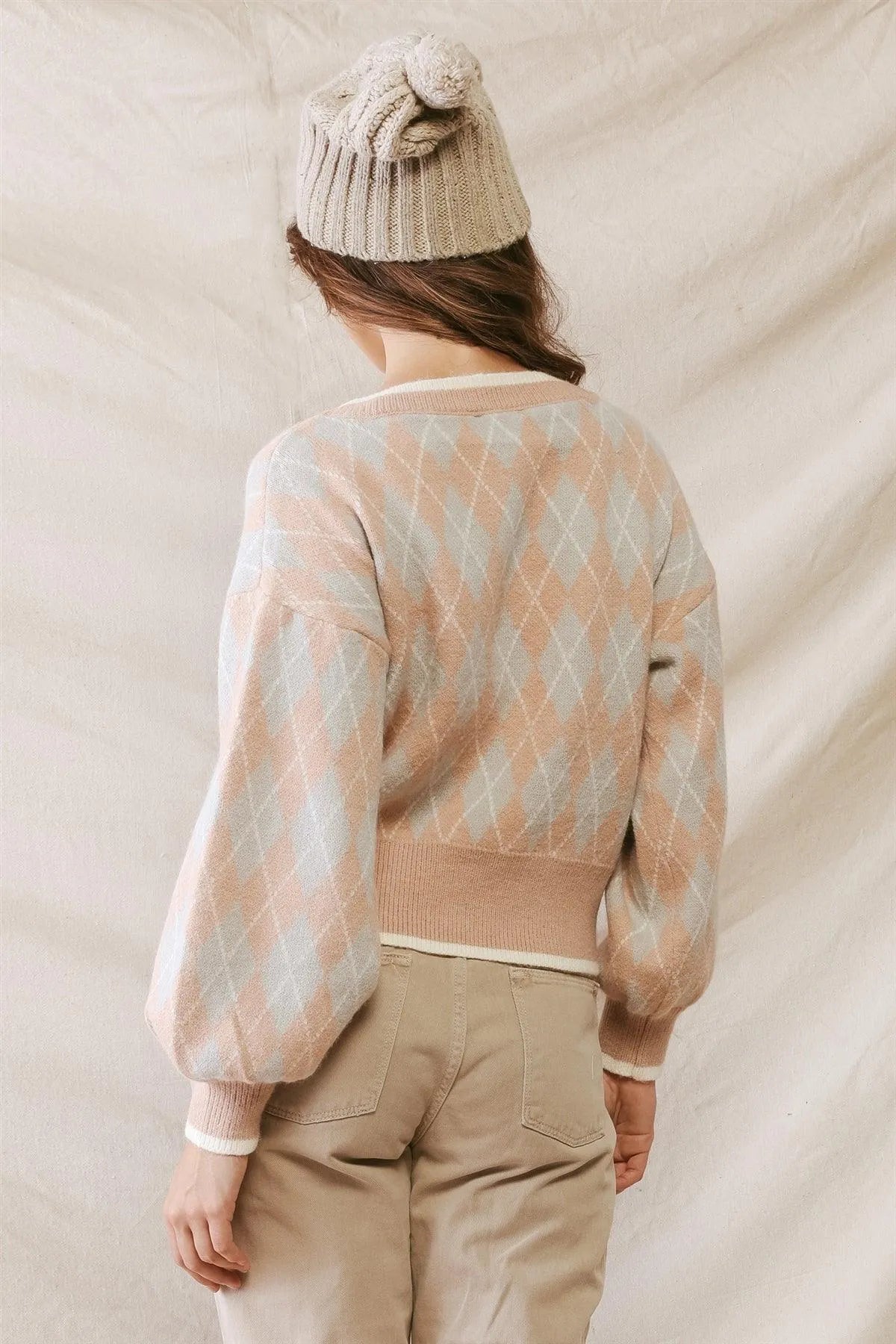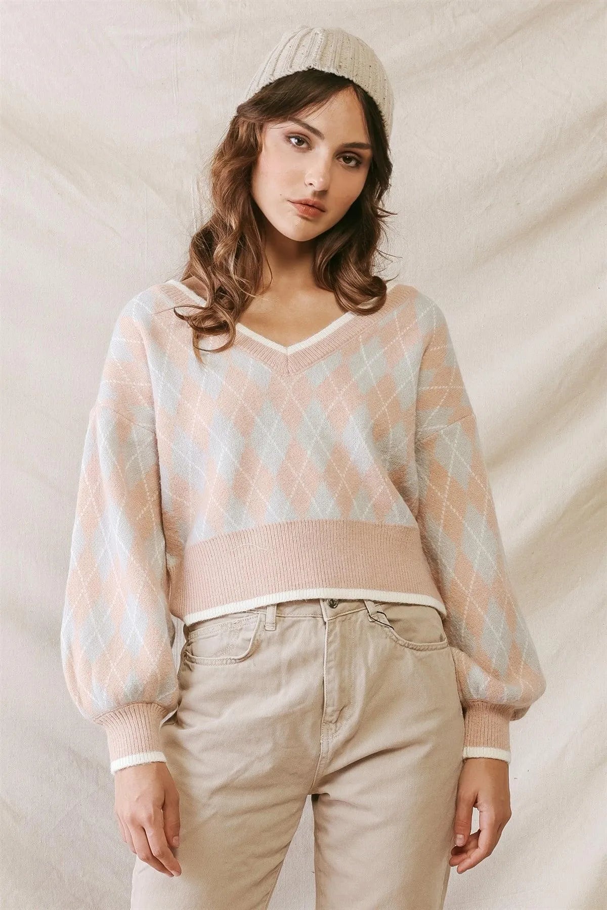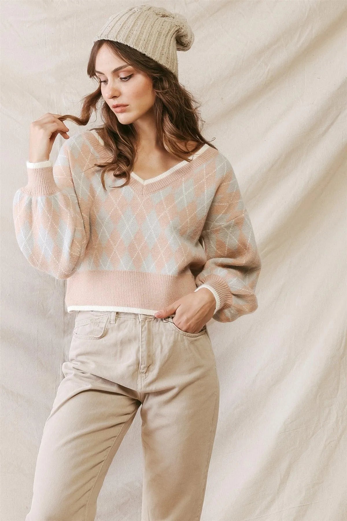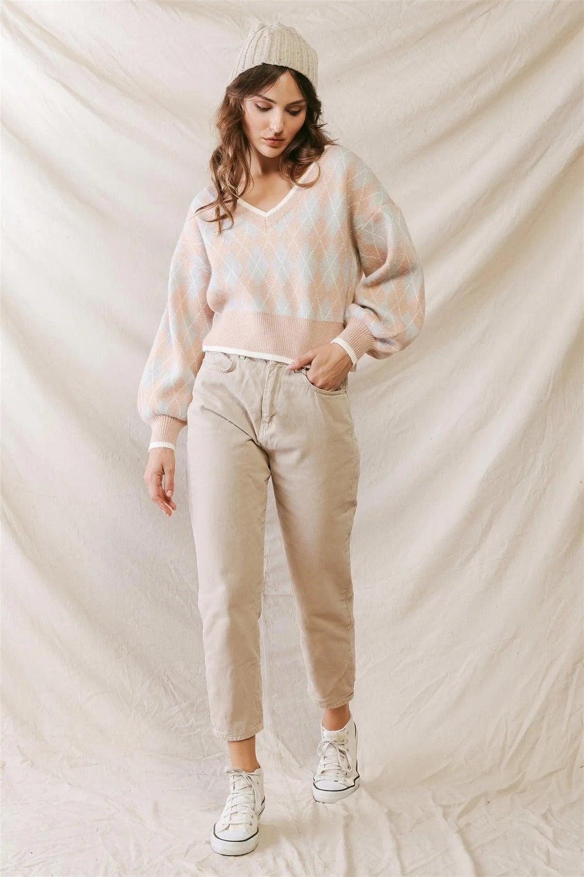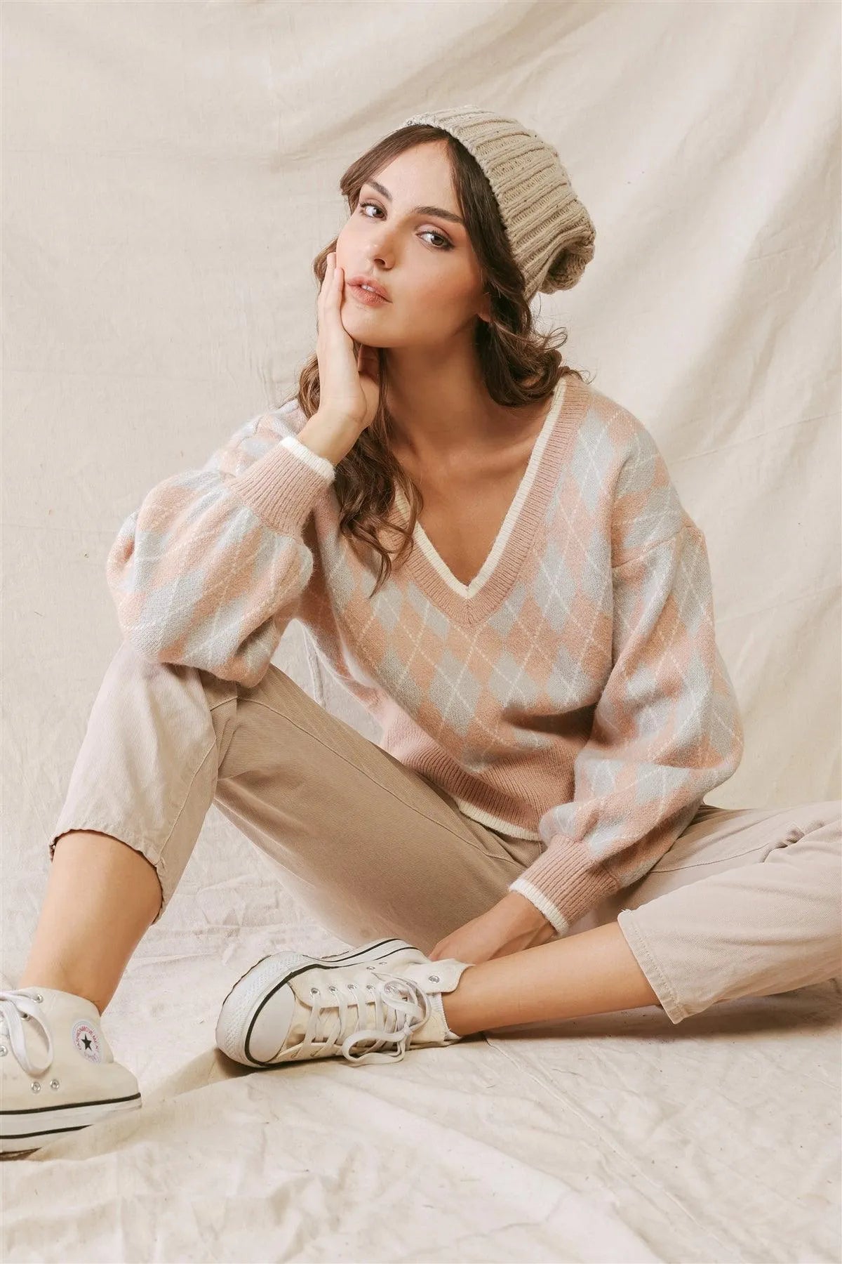 Tan Argyle Print Knit V-Neck Long Sleeve Sweater /2-2-2