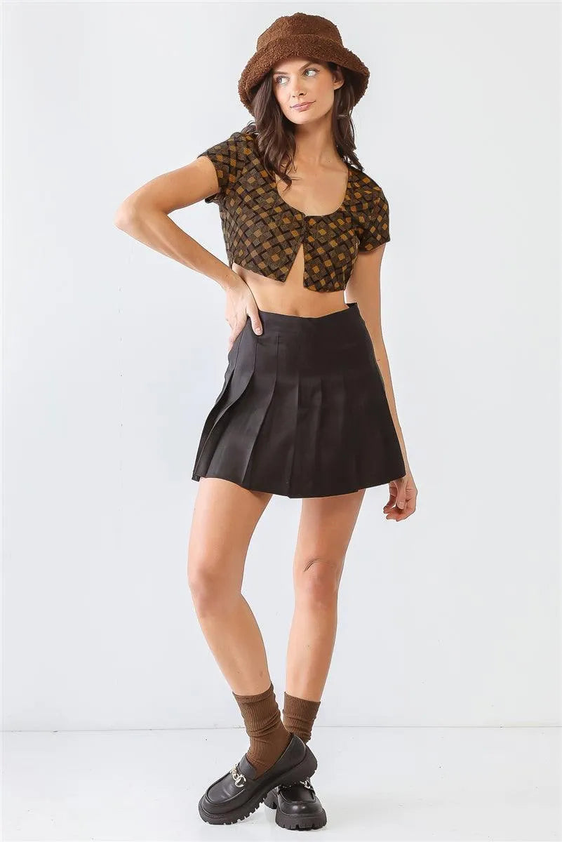 Tan & Black Diamond Print Button Short Sleeve Crop Top /1-2-2-1