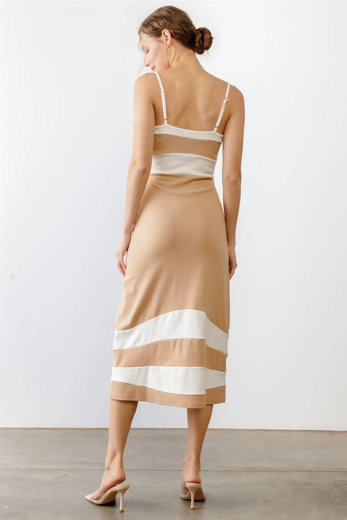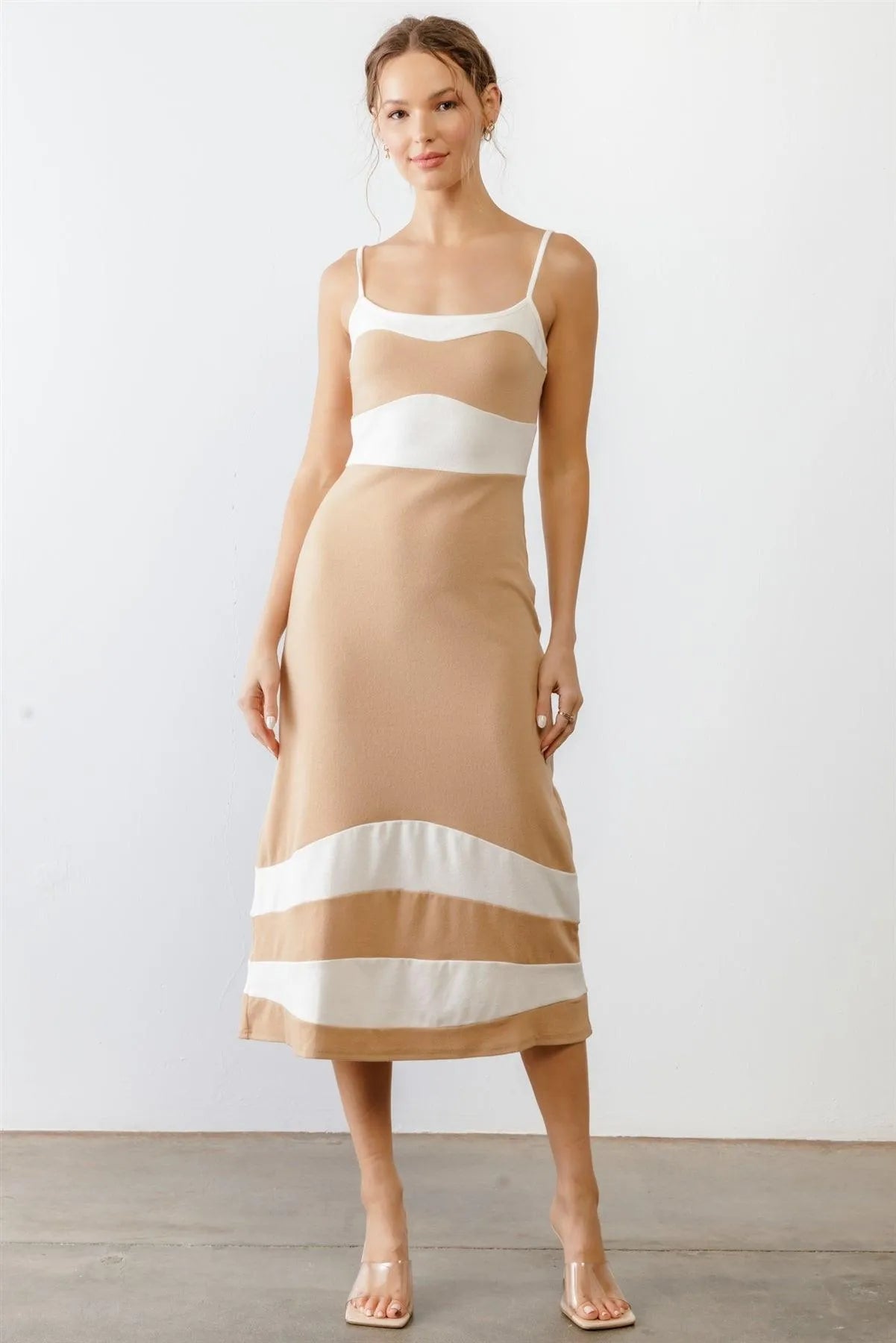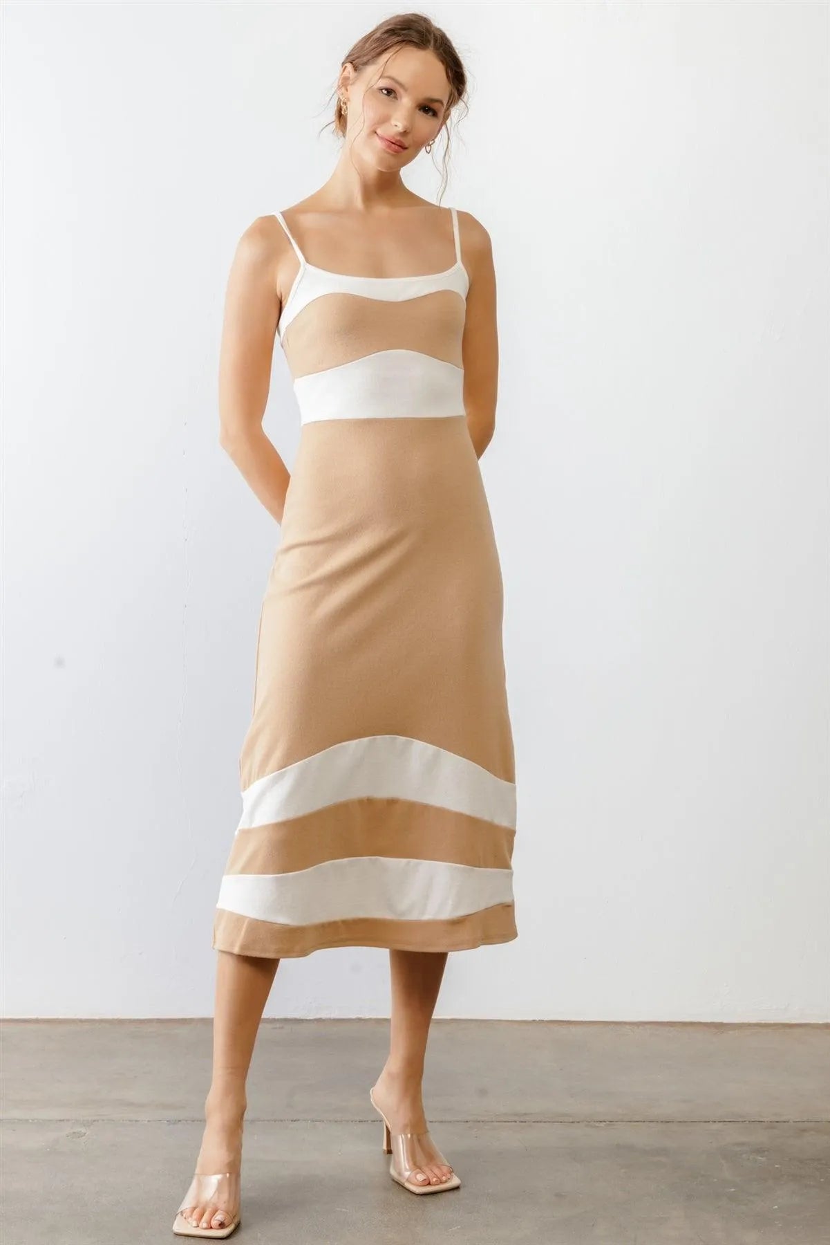 🖤 Item Features: Tan, white stripes, colorblocked, cotton material, square neckline, sleeveless, adjustable straps, midi length, semi stretchy, unlined, cute, cool, trendy, comfy