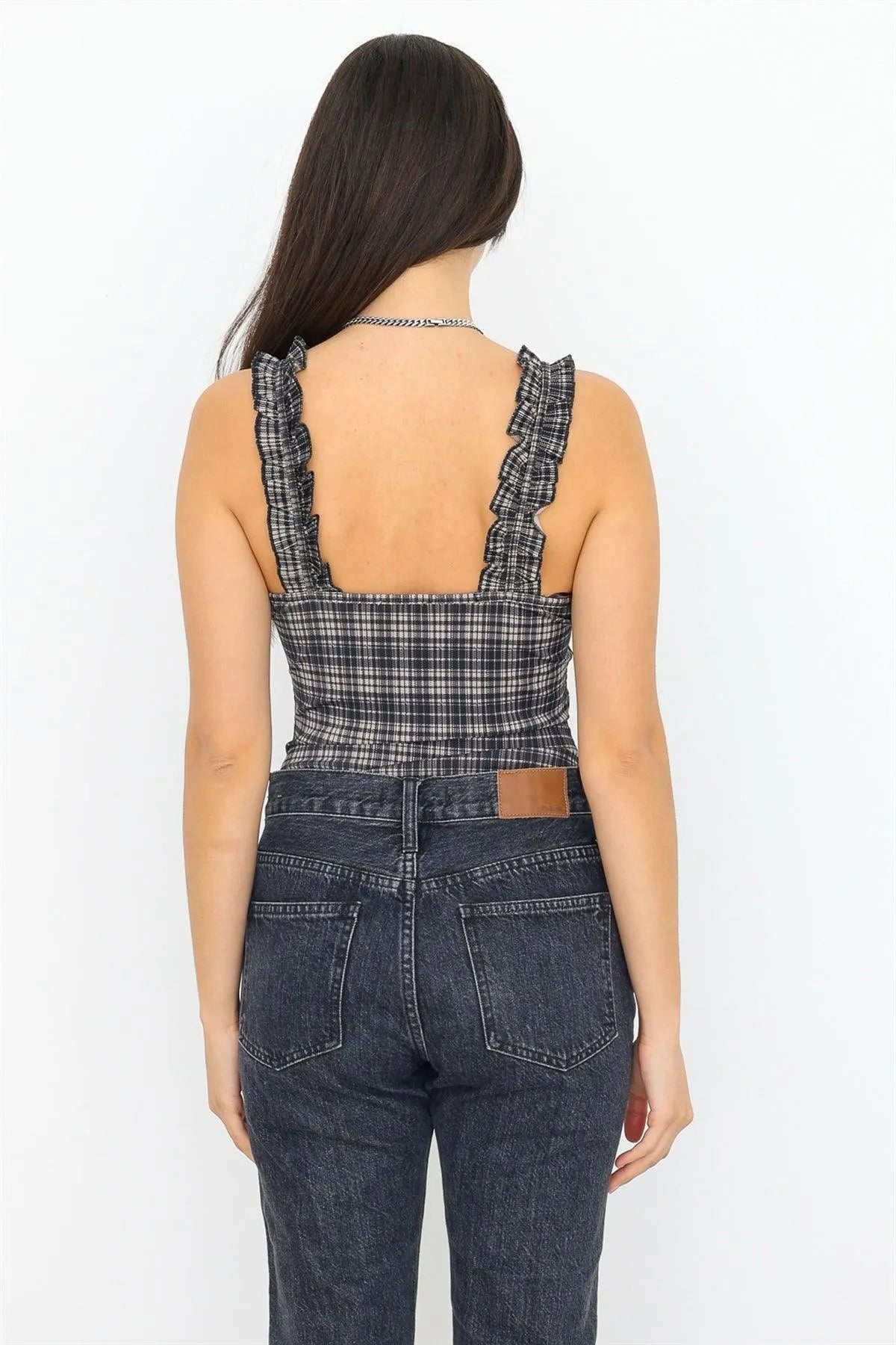 Taupe & Black Plaid Ruffle Detail Sleeveless Fitted Bodysuit /2-2-1