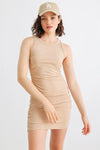 Taupe Cotton Sleeveless Crew Neck Ruched Mini Dress /1-2-1