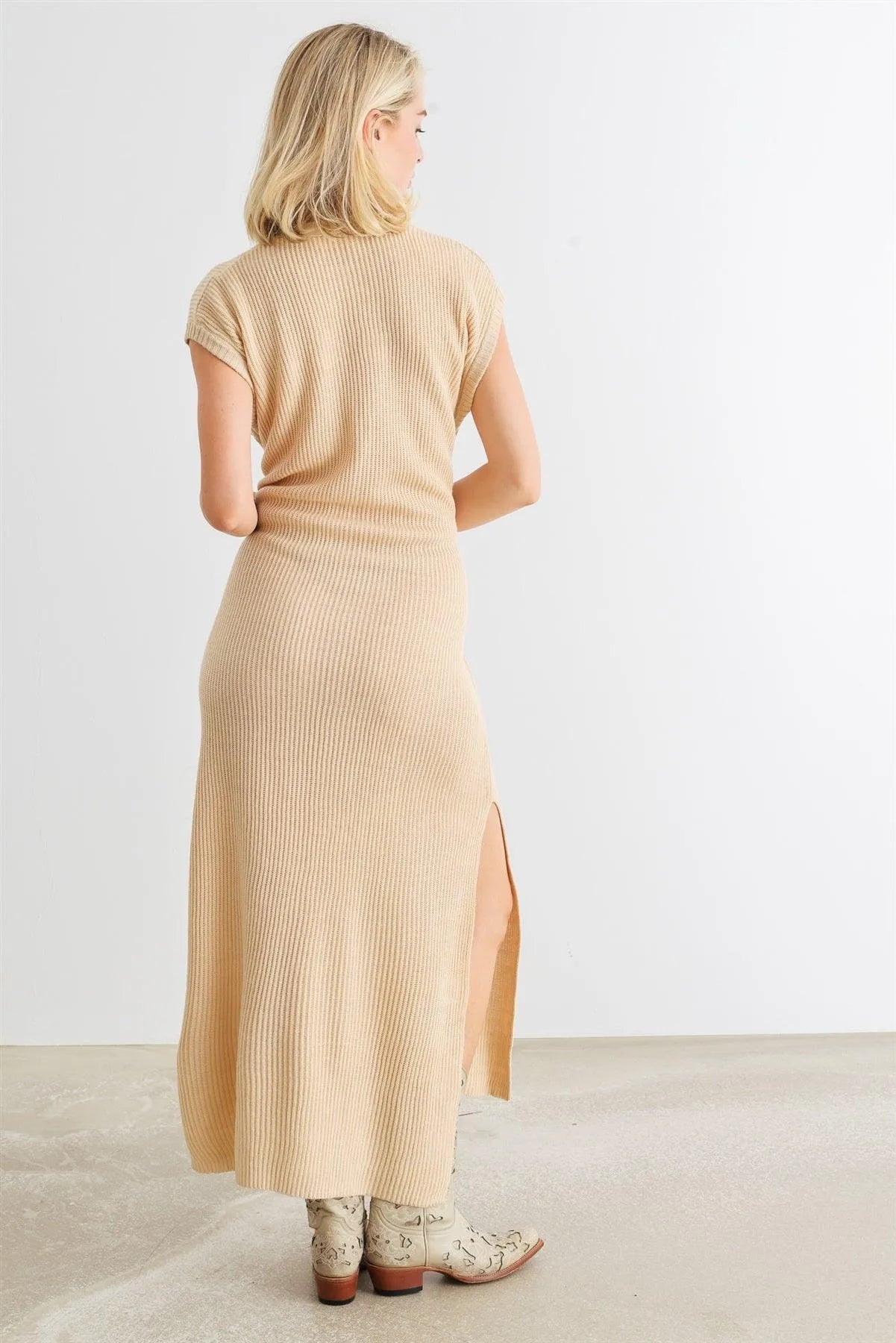 🖤 Item Features: Taupe, knit material, cotton blend, contrast button-up v-neckline, sleeveless, belted, side slits, midi length, semi-stretchy, unlined, casual, cute, warm, cozy, stylish, cool, must-have
