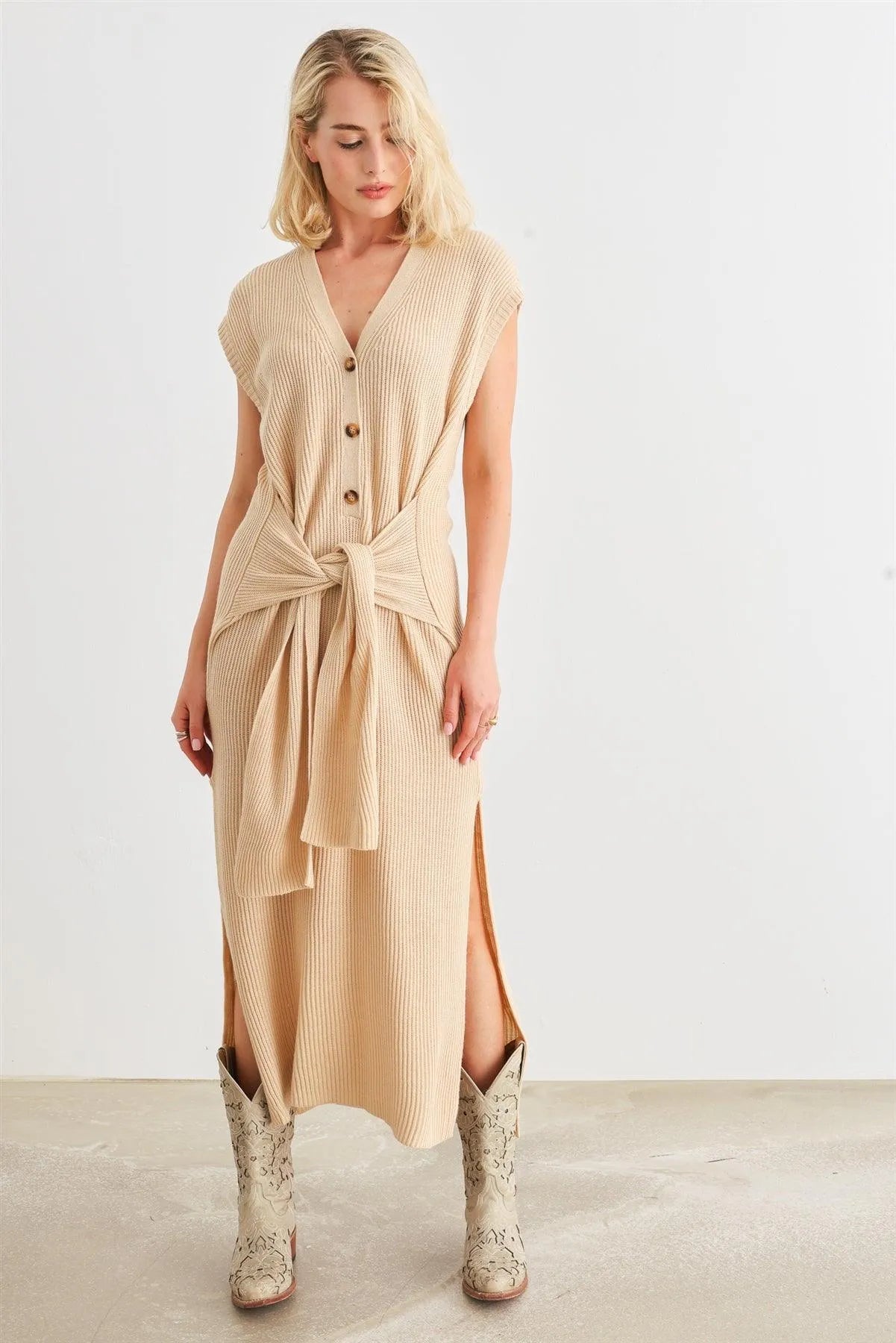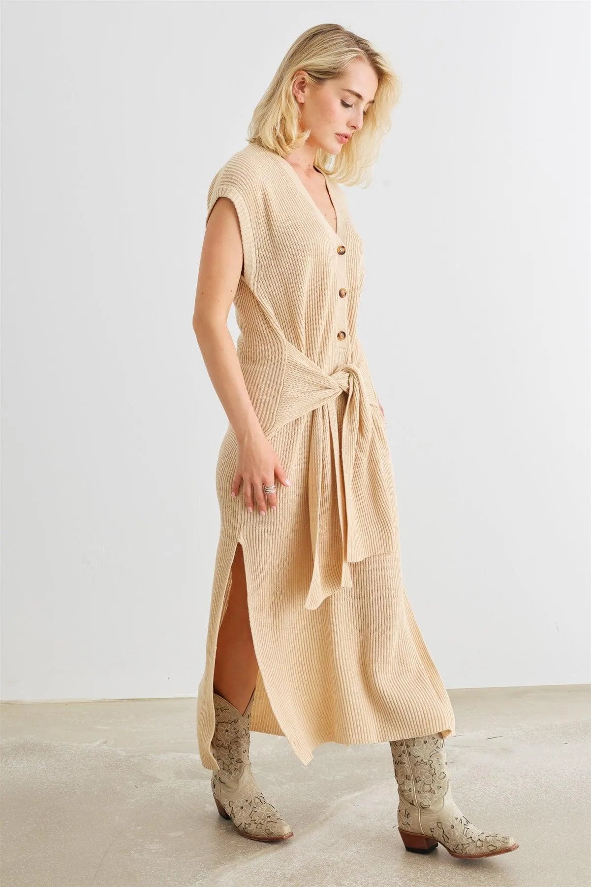 Taupe Knit Button-Up Sleeveless Belted Midi Sweater Dress /2-2-1