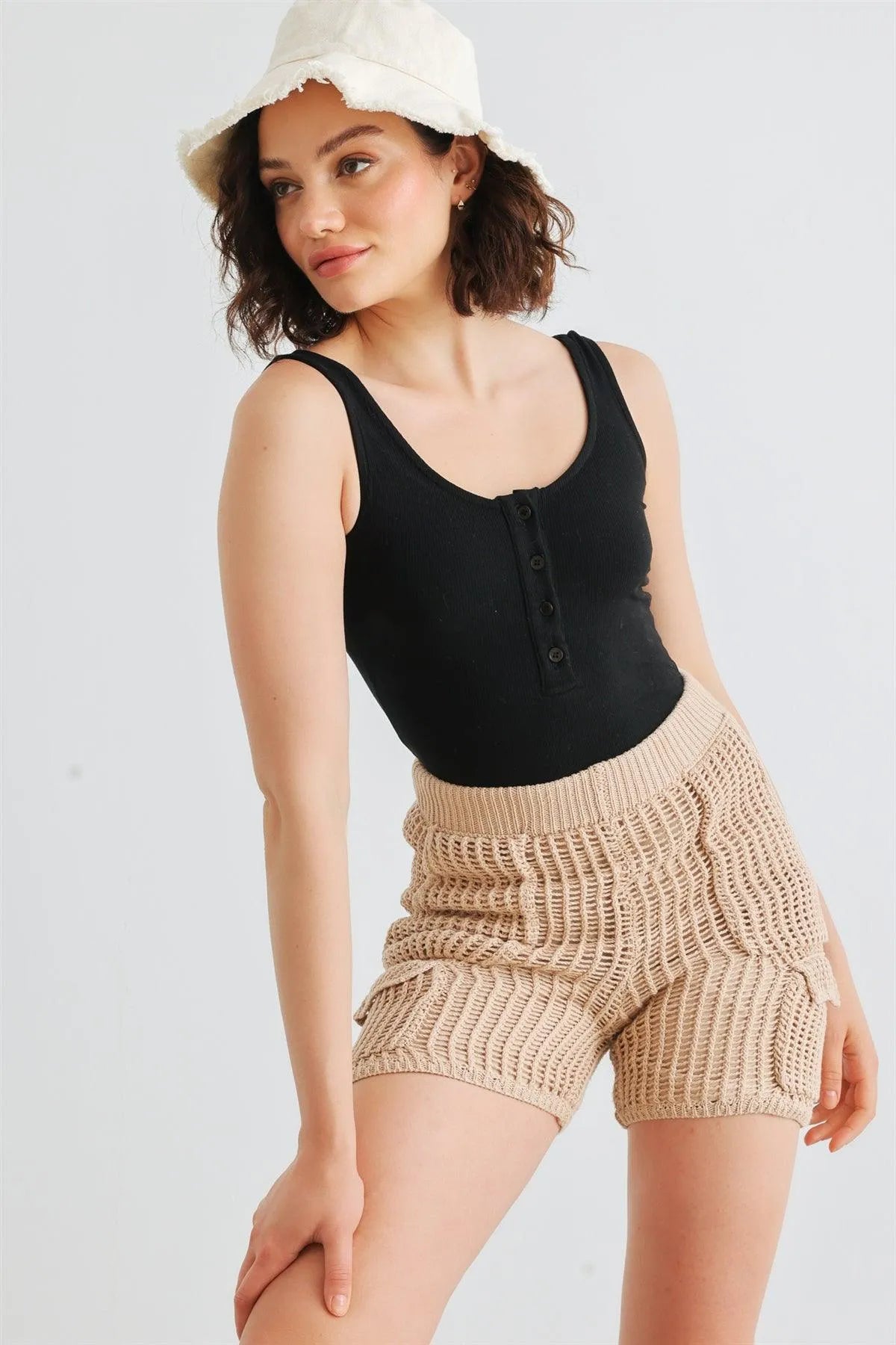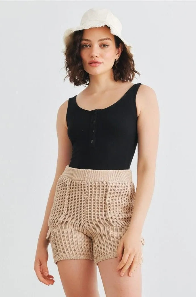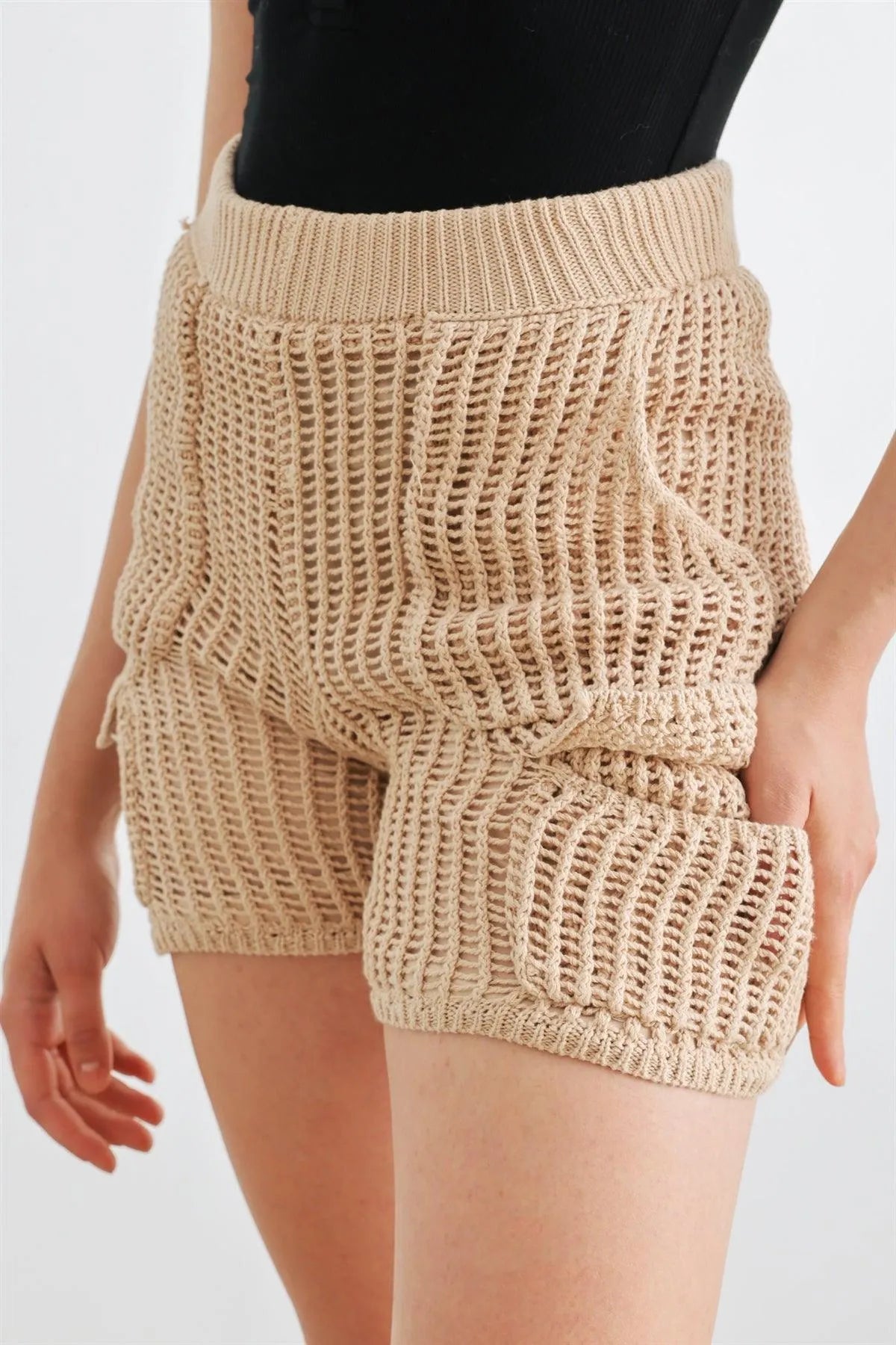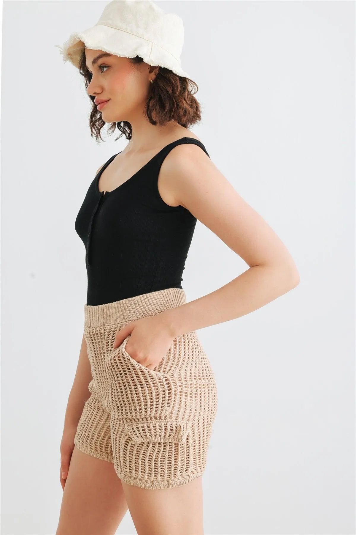 Taupe Knit Cotton Four Pocket High Waist Shorts