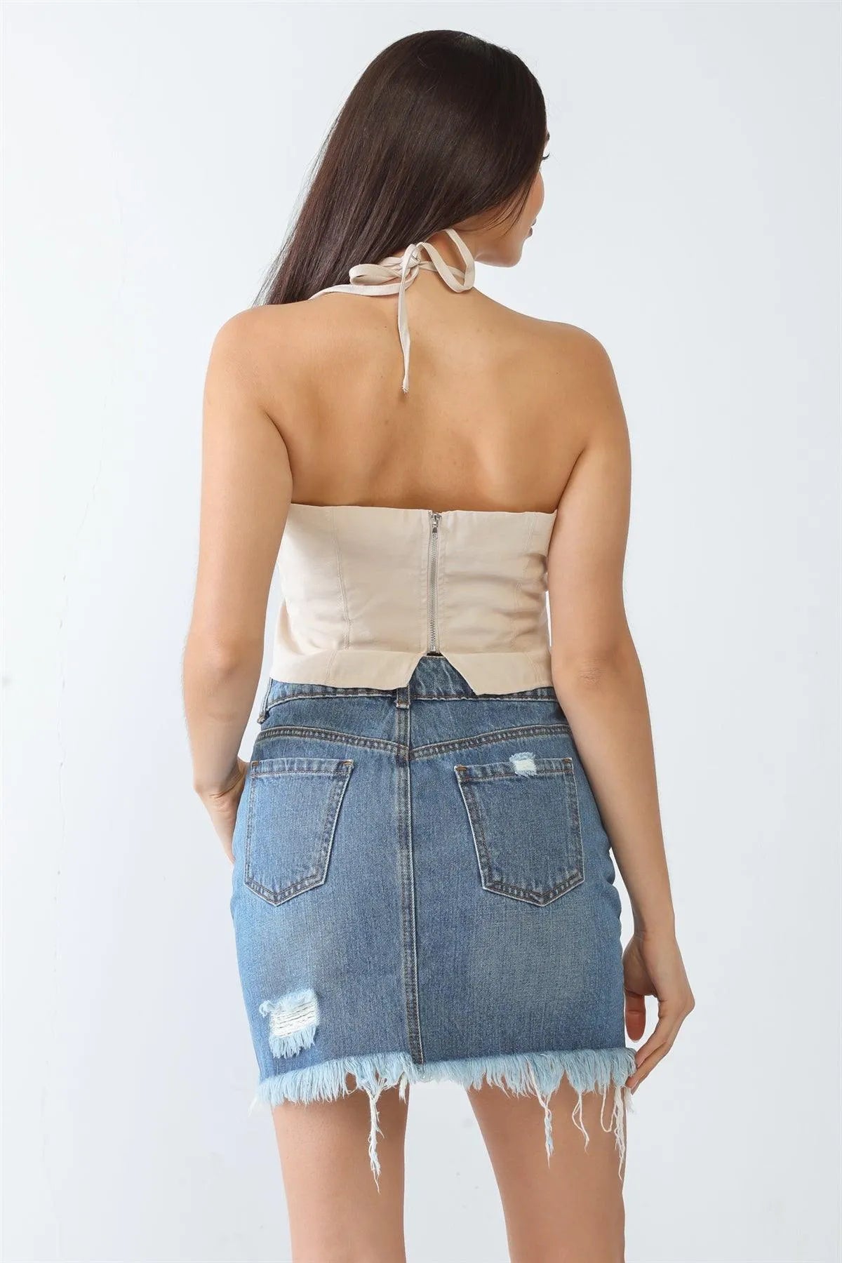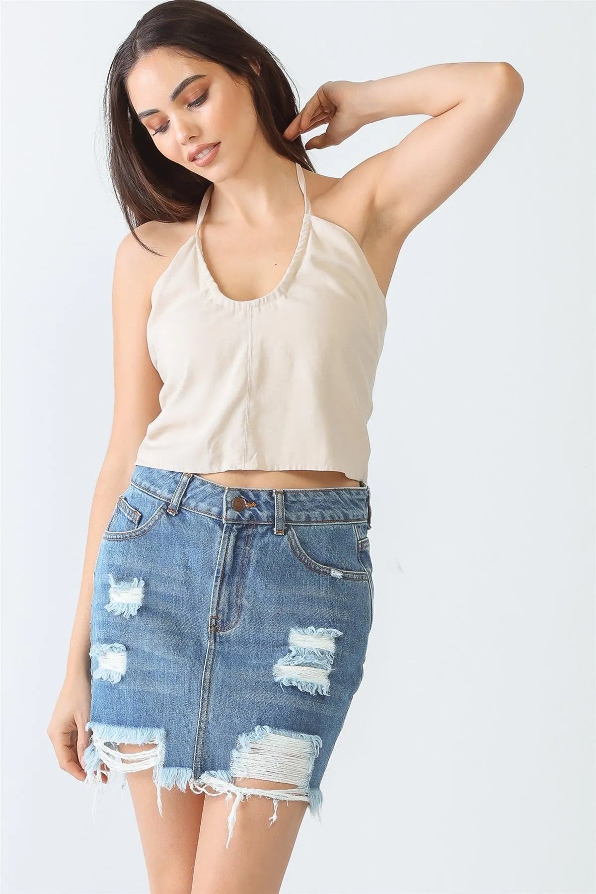 Taupe Sleeveless Halter Neck Strappy Crop Top /3-2-1