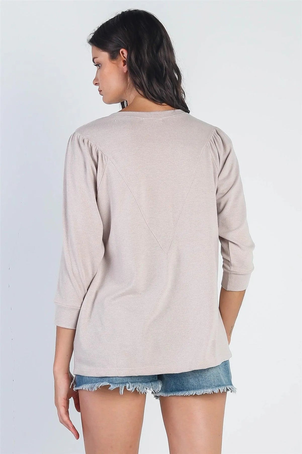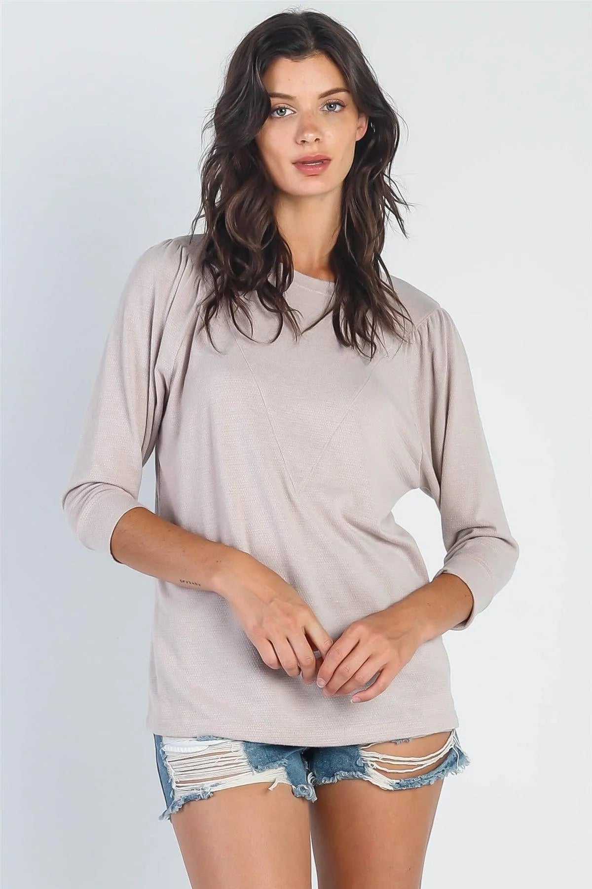 🖤 Item Features: Taupe, textured, crew neckline, cuffed midi sleeve, relaxed fit, non-stretchy, not see through, unlined, cozy and comfy, warm, casual, fall/winter collection, soft to touch.