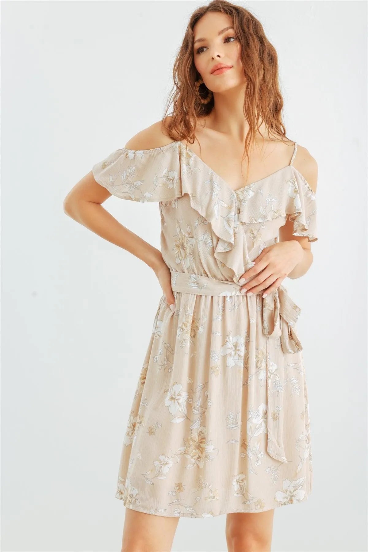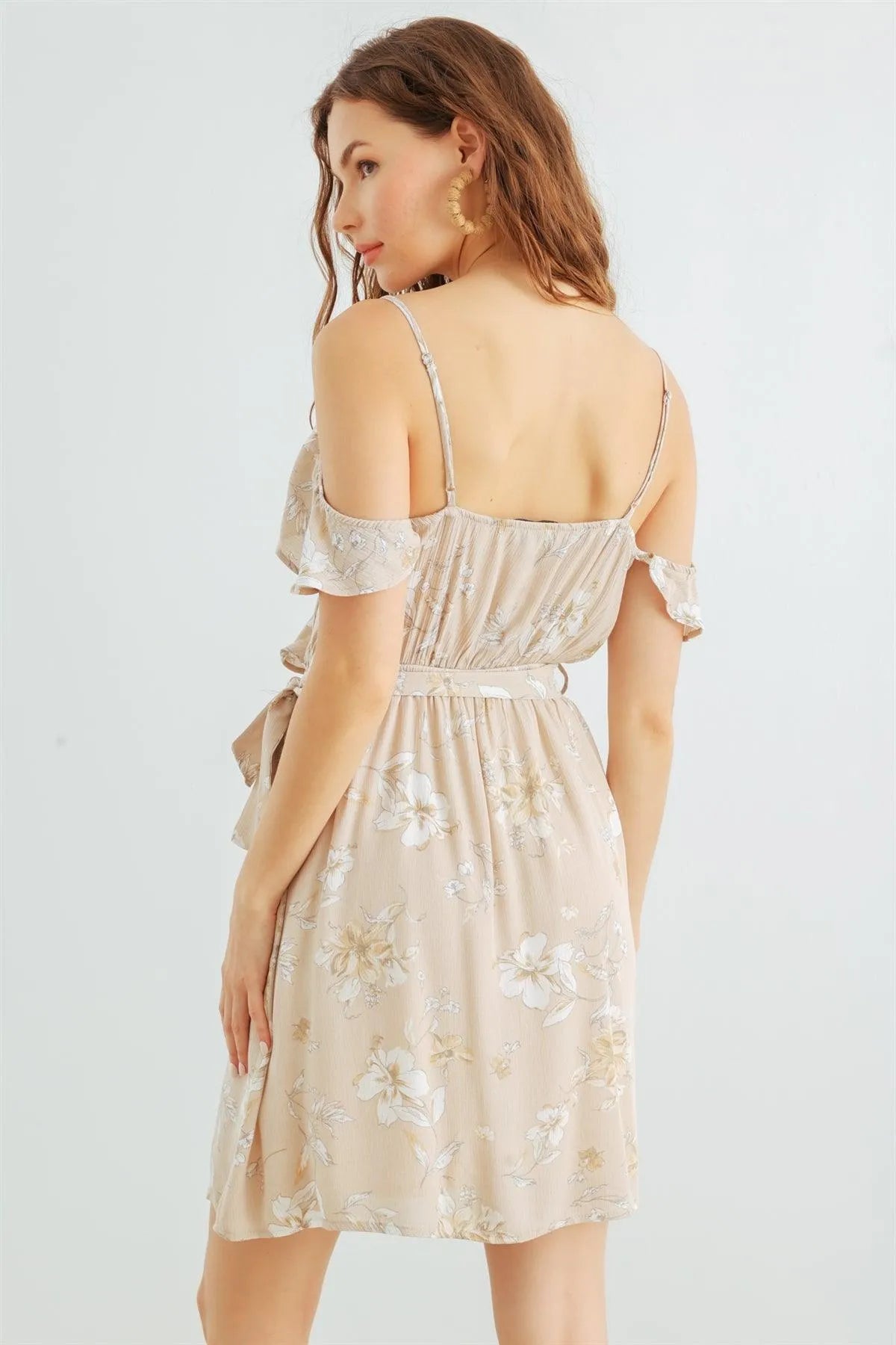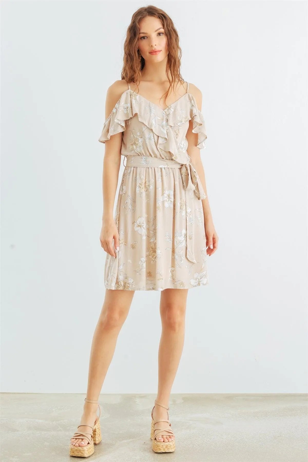 Taupe & White Floral Cold Shoulder Wrap Neck Ruffle Belted Mini Dress /1-3-3