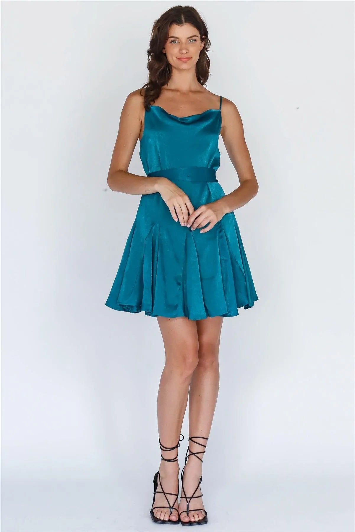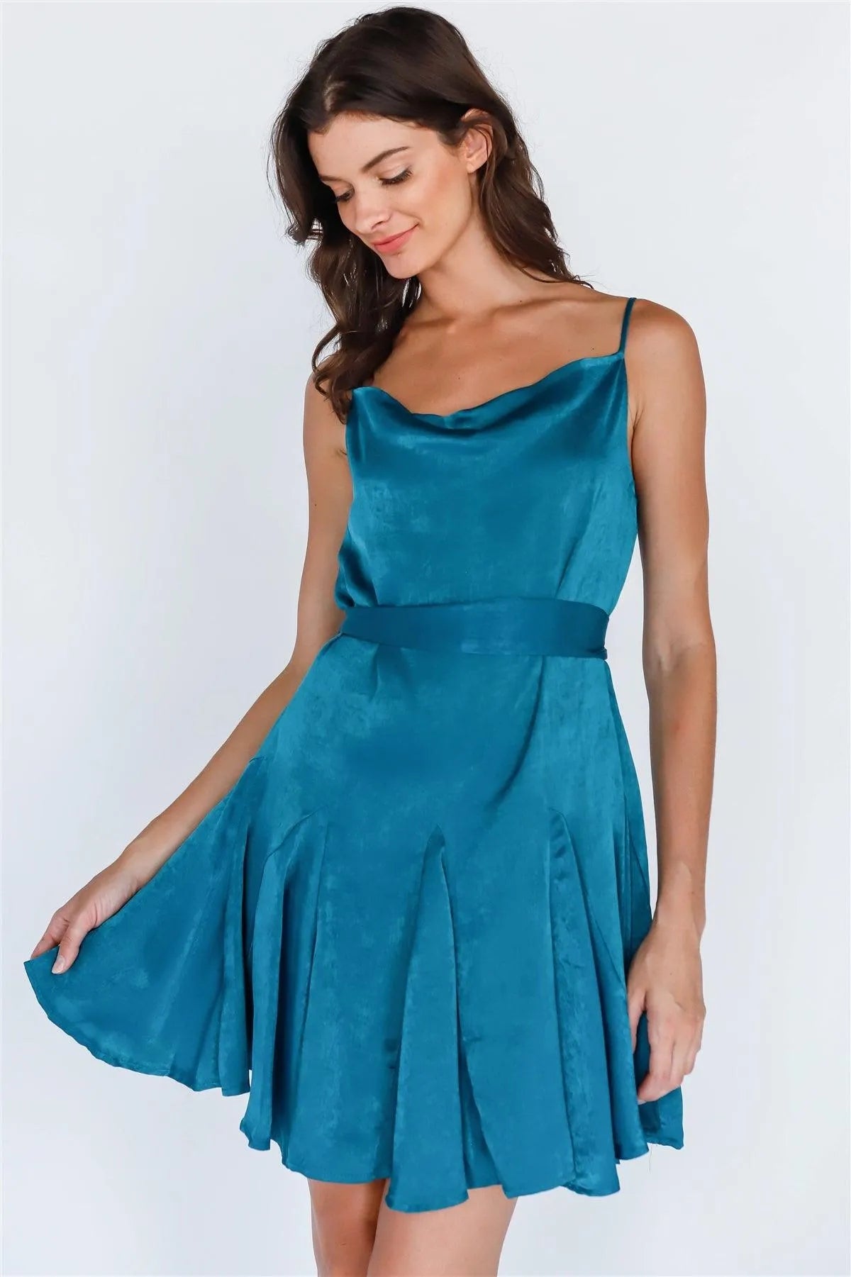 Teal Satin Effect Self-Tie Belt Flare Cowl Neck Mini Dress /1-2-2-1