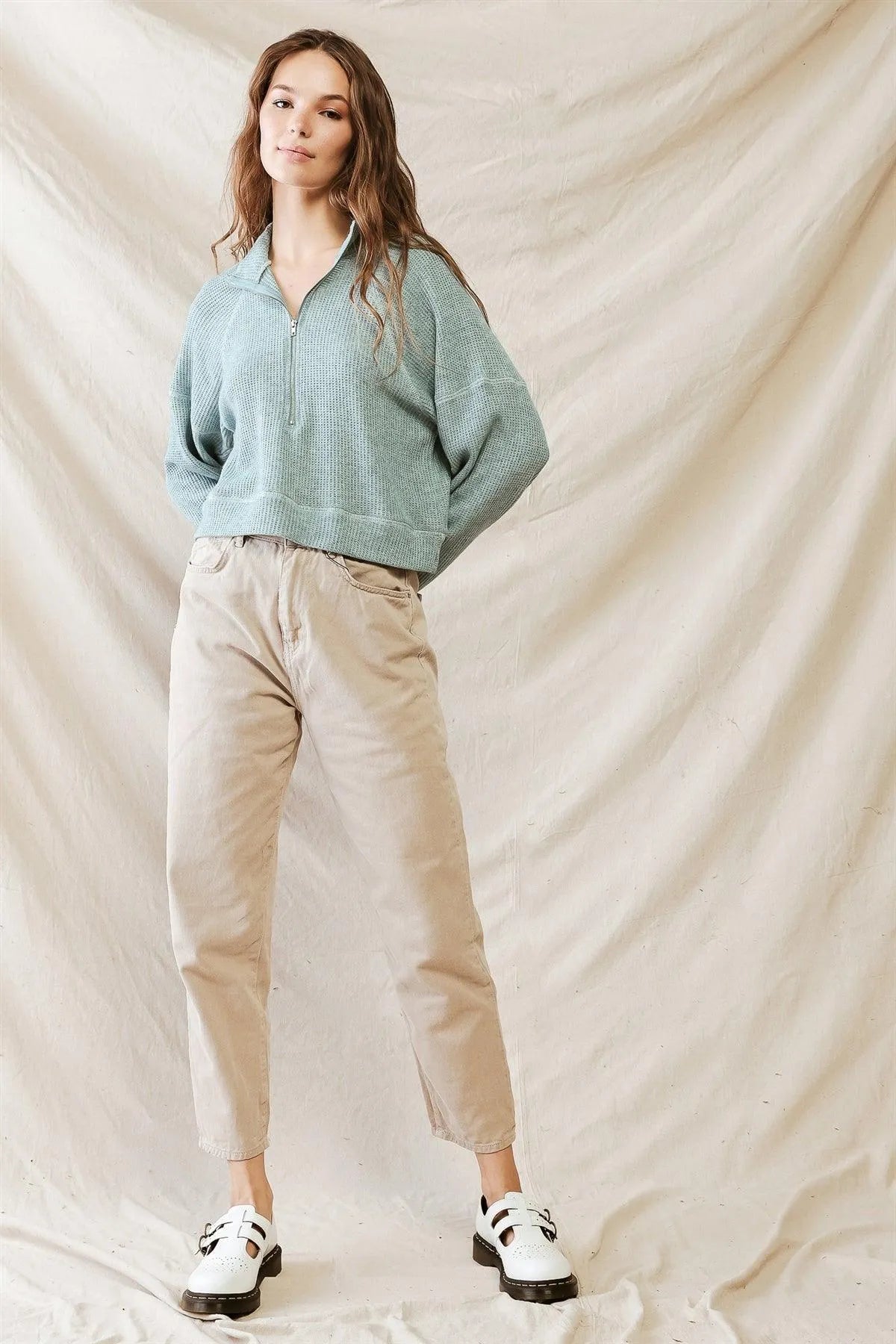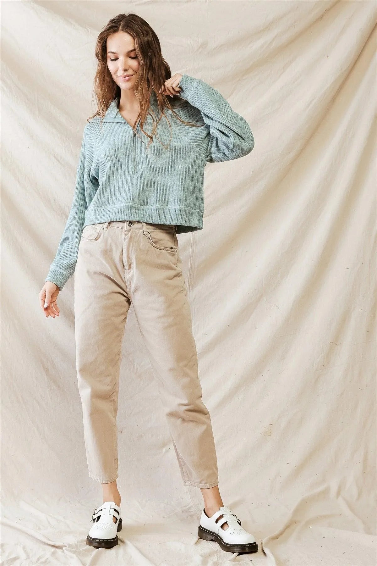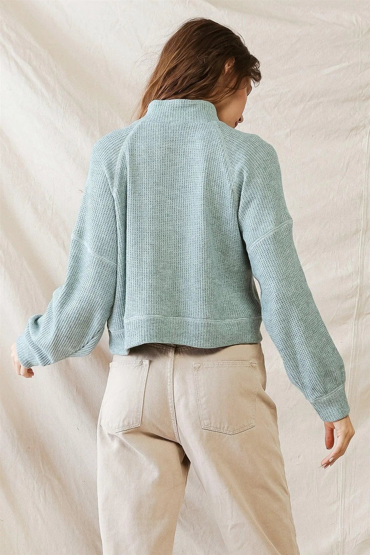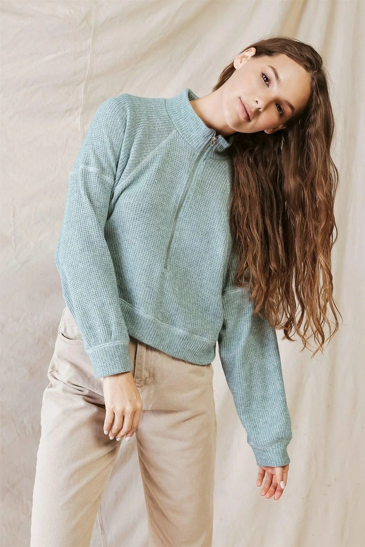 Teal Waffle Knit Front Zip-Up Long Sleeve Sweater /1-2-2-1