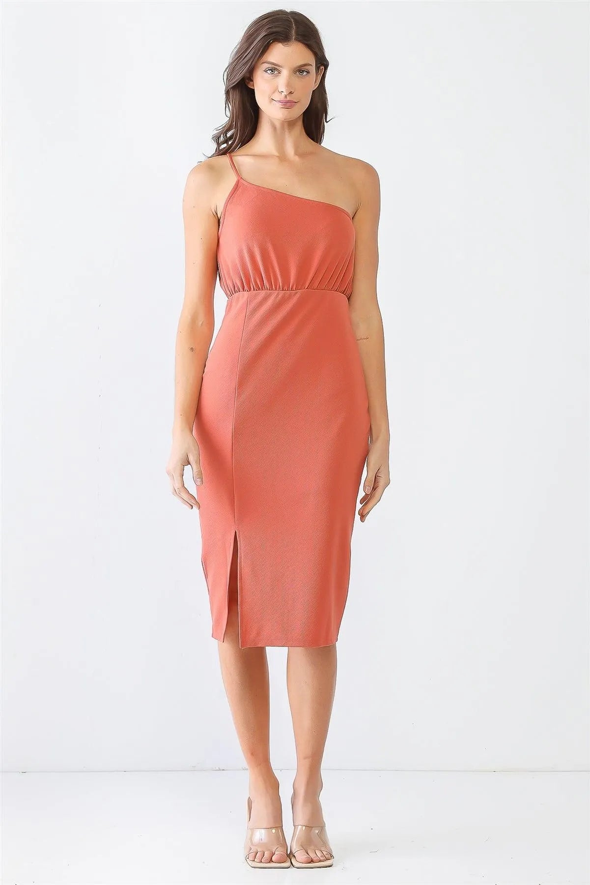 Terracotta Textured One Shoulder Sleeveless Midi Dress /2-2-2