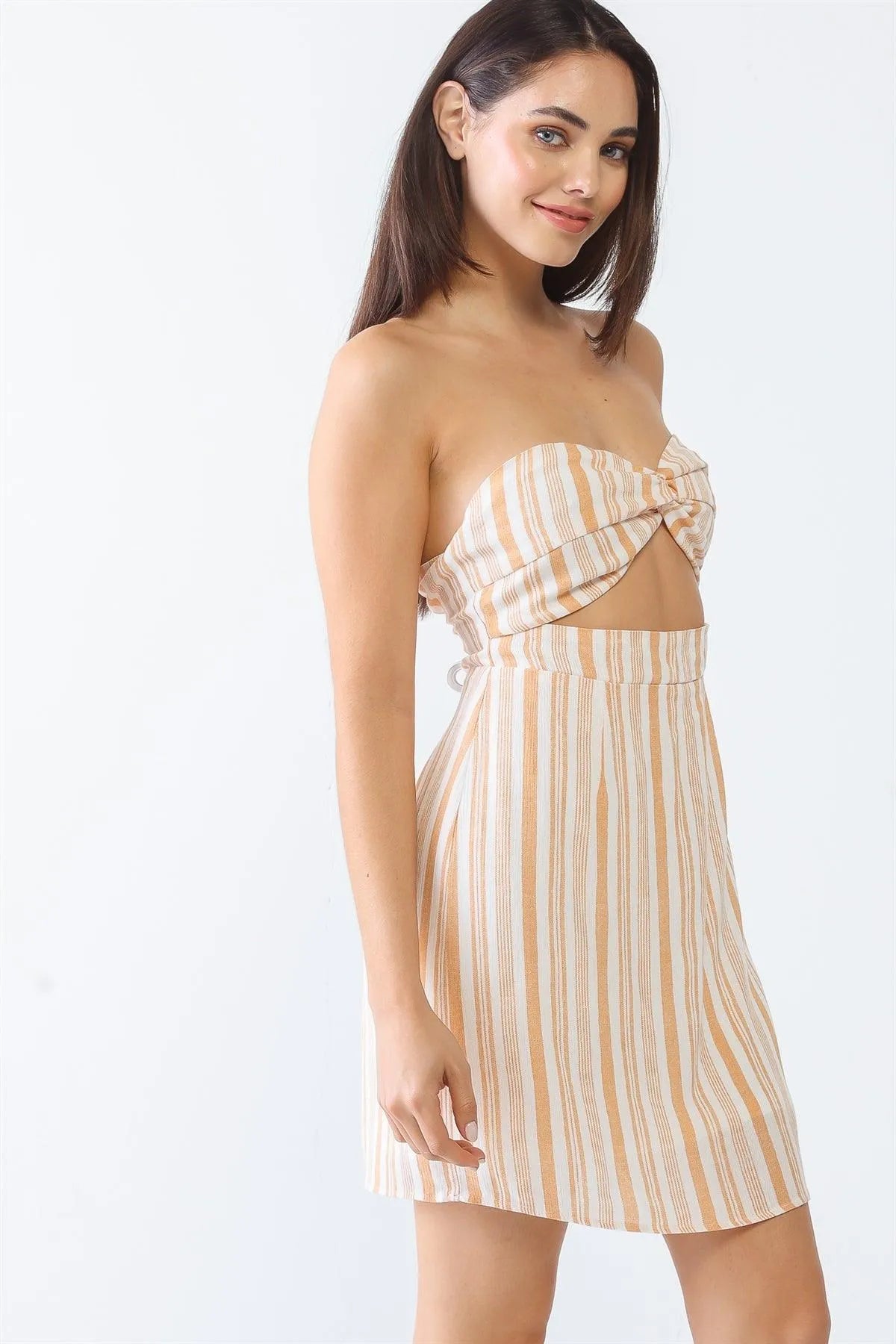 White & Apricot Stripe Print Strapless Twist Cut-Out Smocked Back Mini Dress /3-2-1