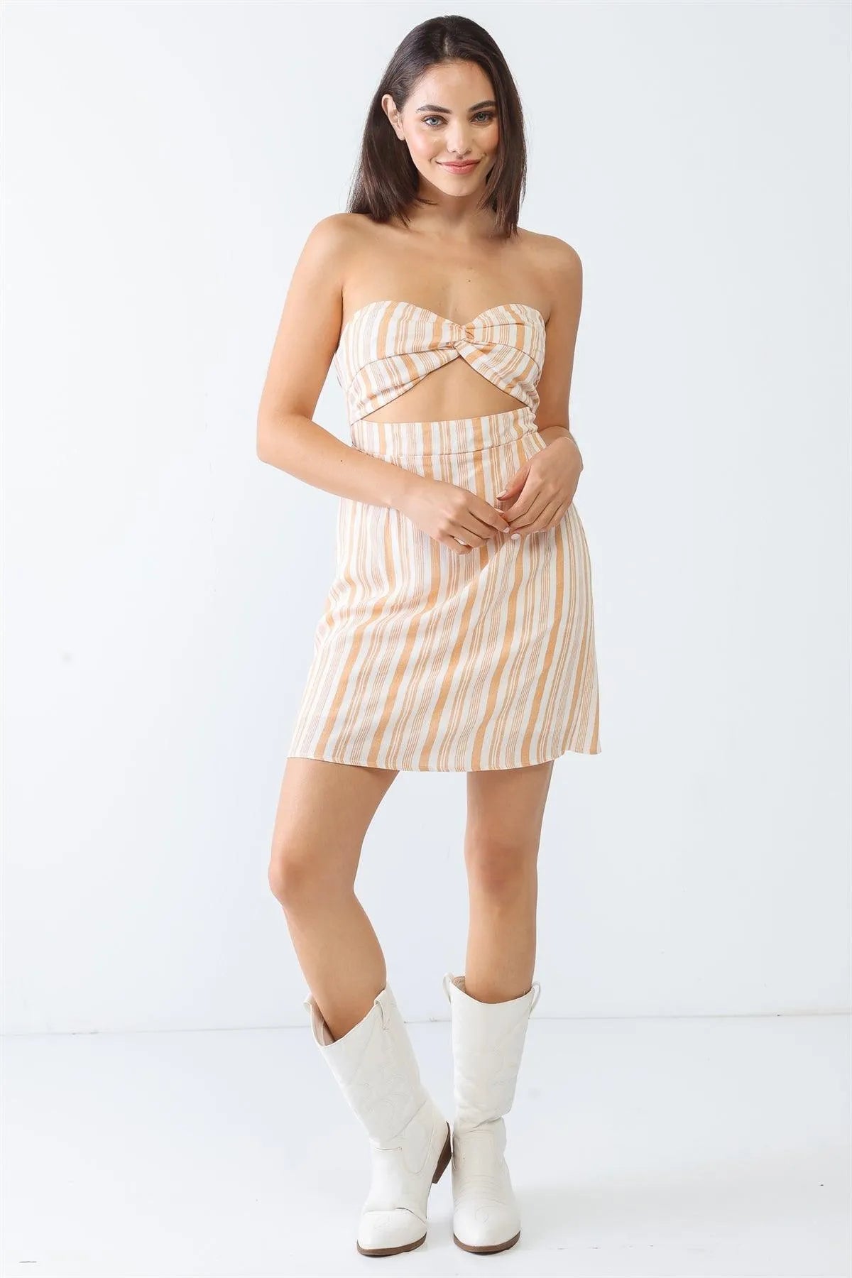 🖤 Item Features: White & apricot, stripe print, strapless, front twist detail, cut-out style, back hidden zip-up closure, smocked back, mini length, semi-stretchy, lined, not see through, casual, cute, cool