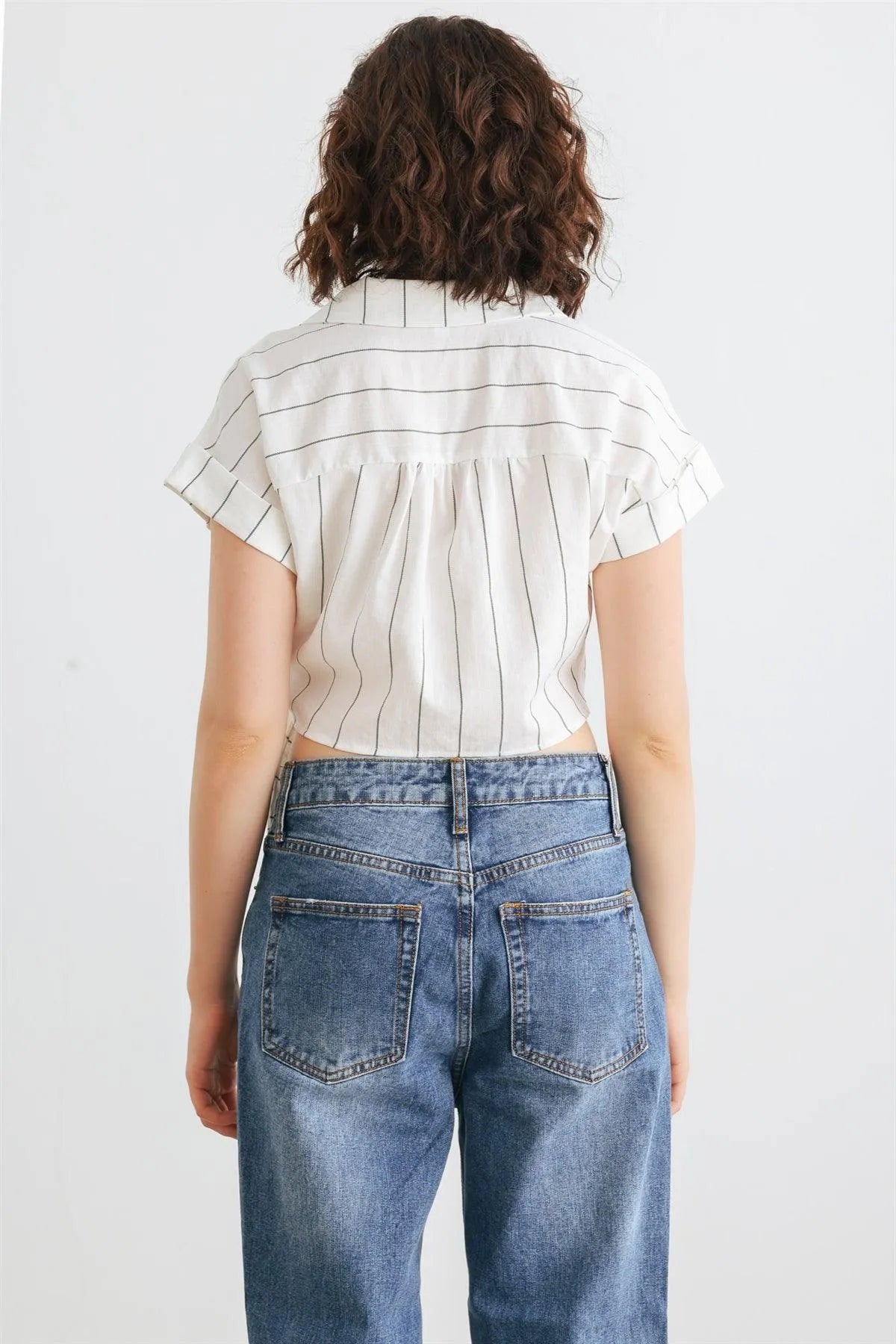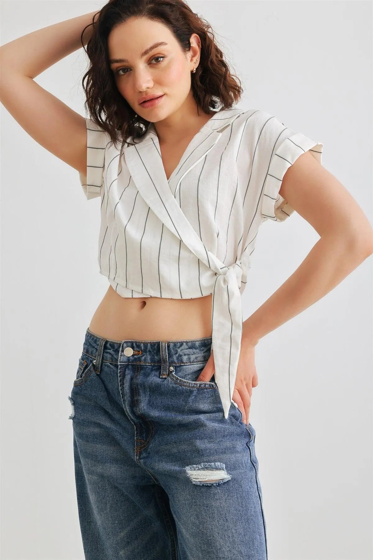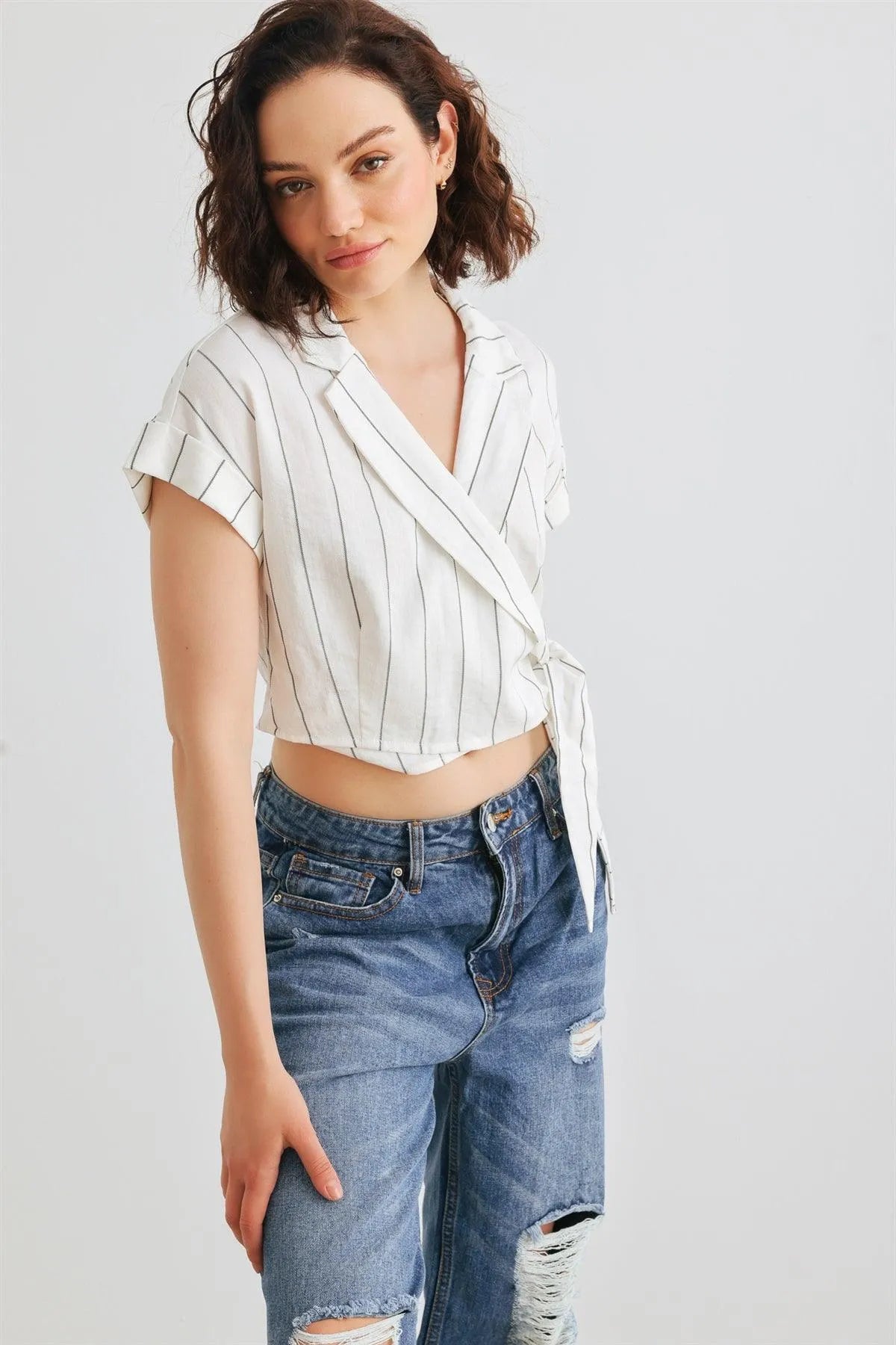 🖤 Item Features: White & black, vertical stripes print, roll-up short sleeves, collared wrap v-neckline with button, self-tie closure hem, cropped length, non-stretchy, not see through, unlined, cool, elegant, stylish, trendy