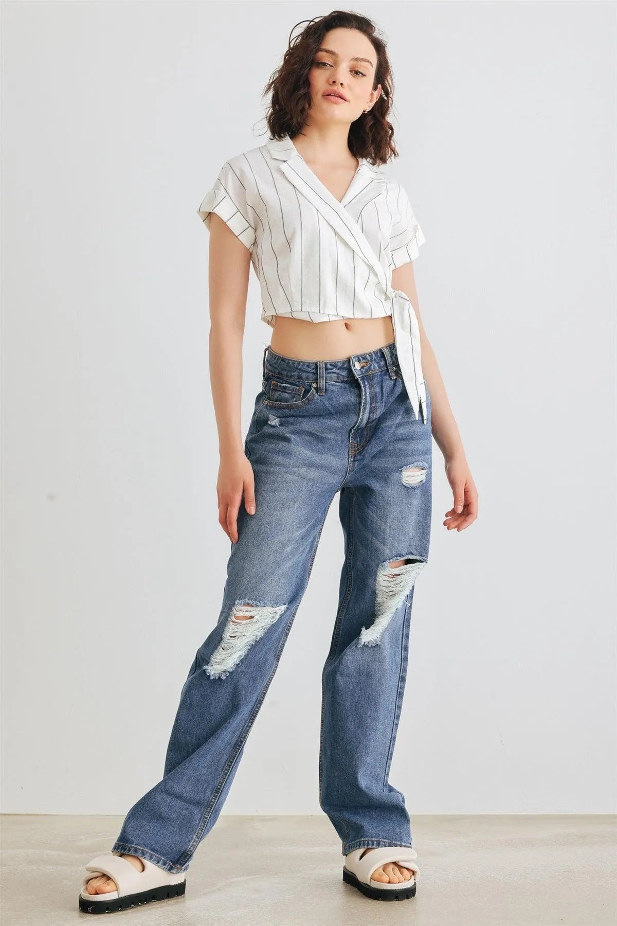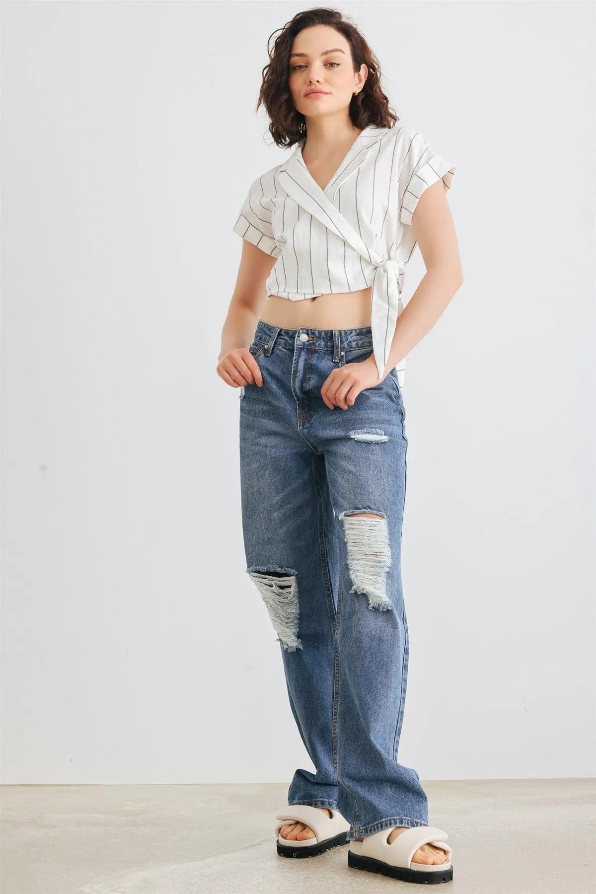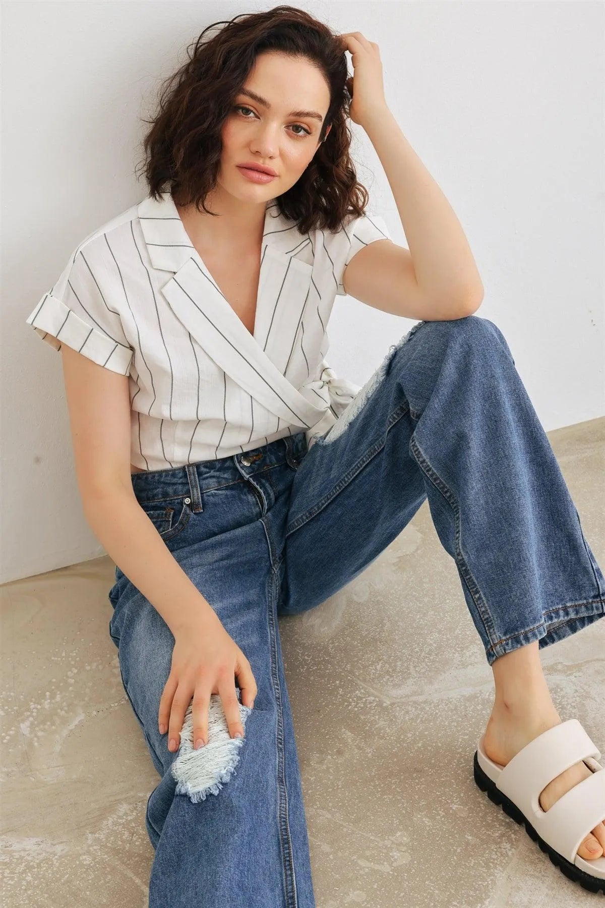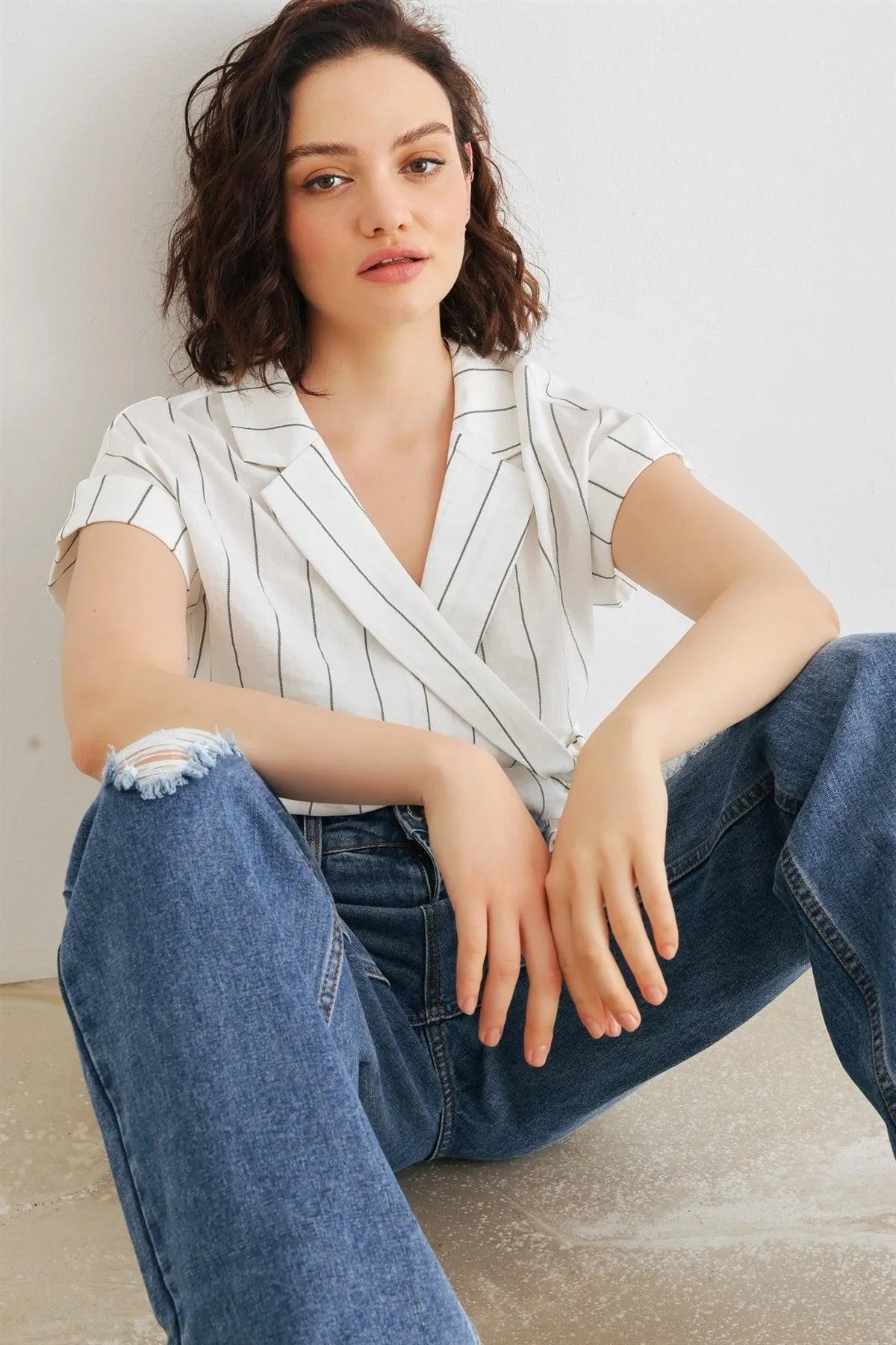 🖤 Item Features: White & black, vertical stripes print, roll-up short sleeves, collared wrap v-neckline with button, self-tie closure hem, cropped length, non-stretchy, not see through, unlined, cool, elegant, stylish, trendy