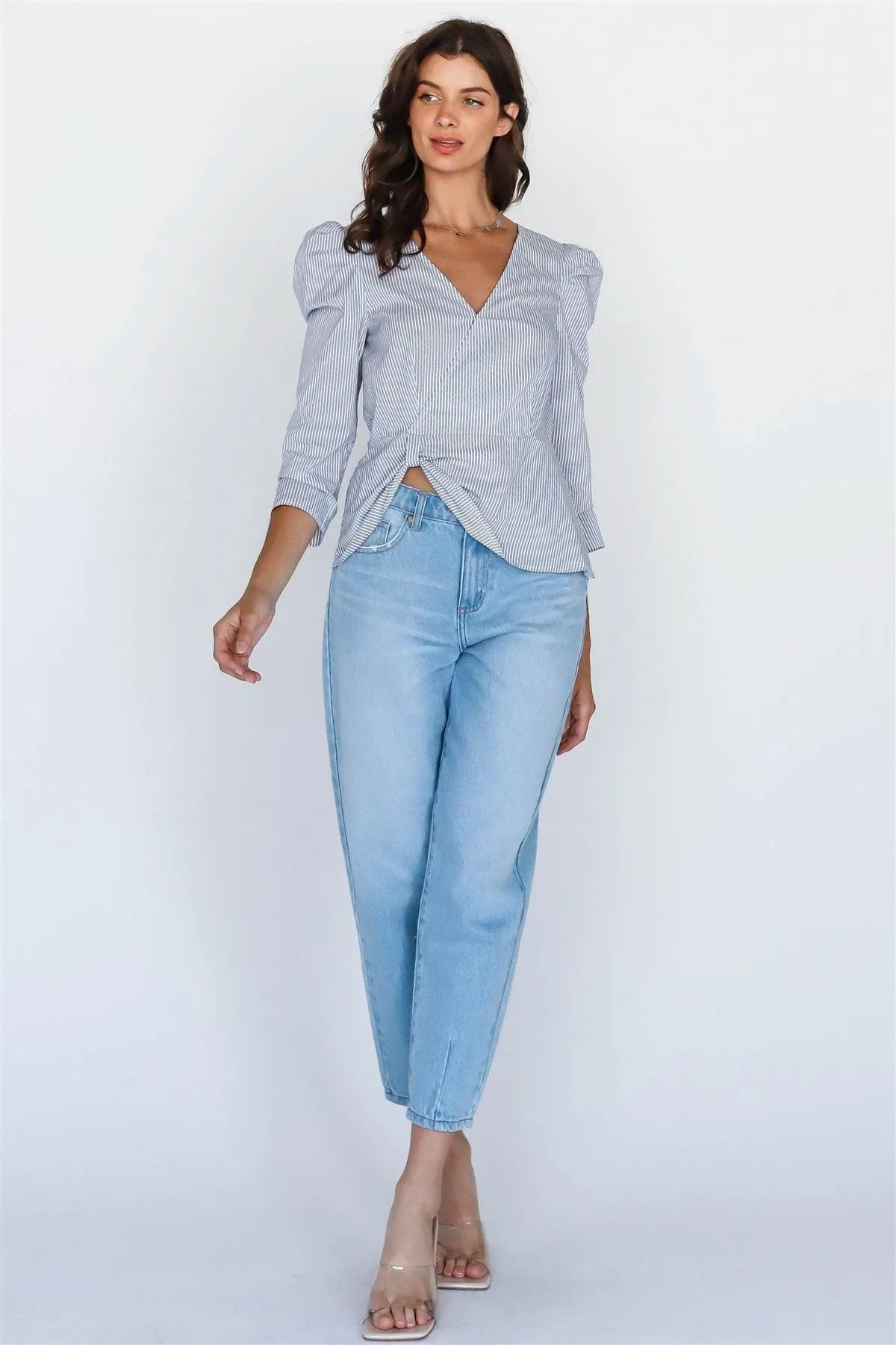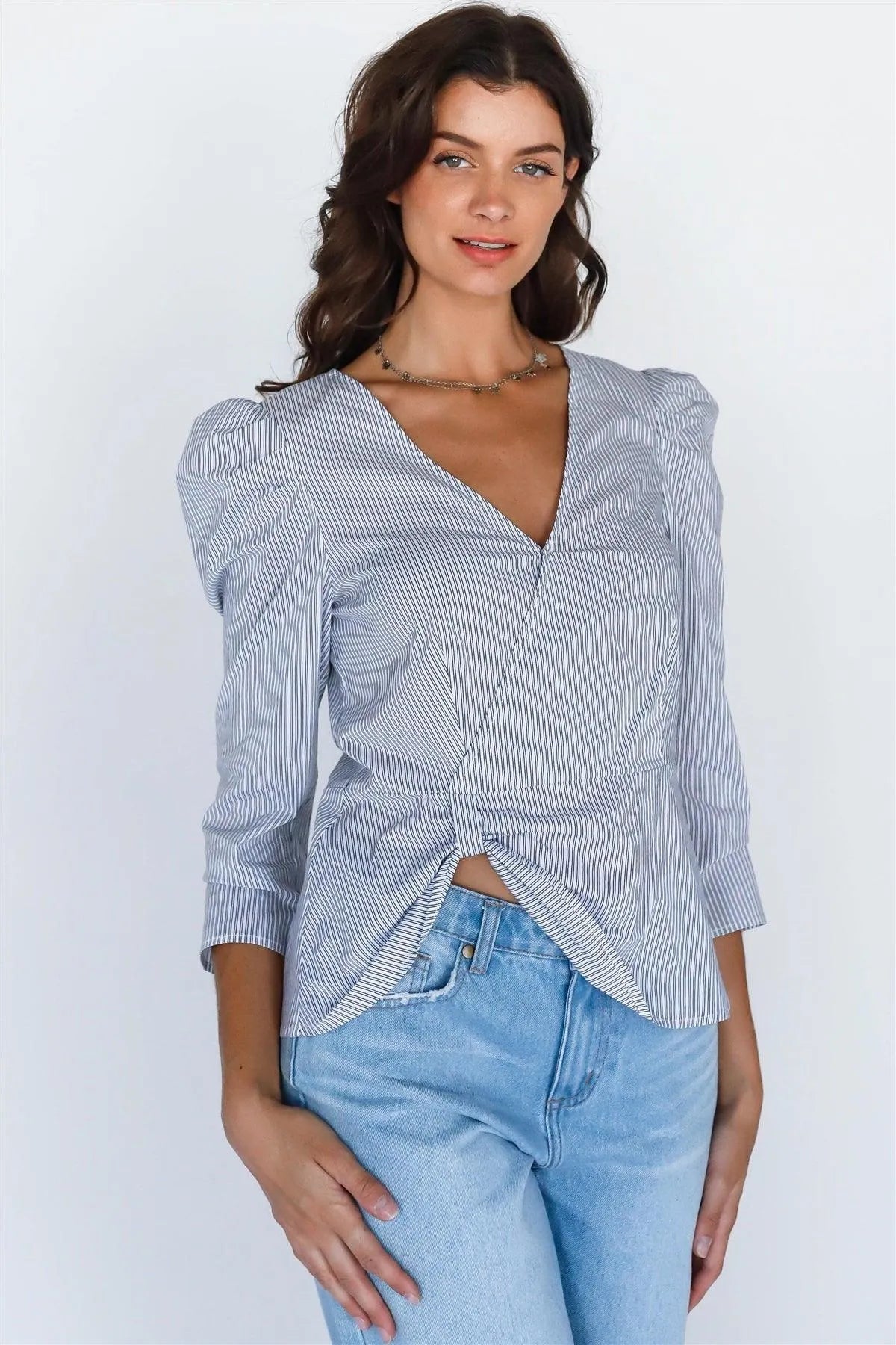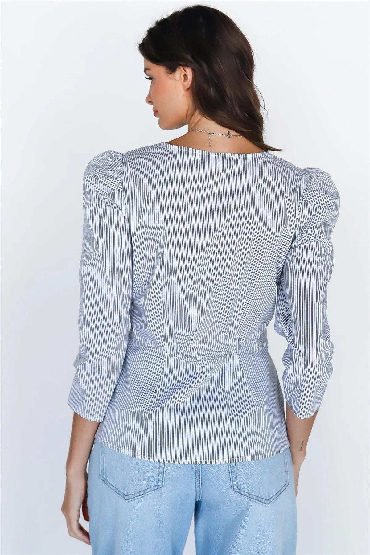 White Black Striped Wrap V-Neck Puff Midi Sleeve Top /1-2-2-1