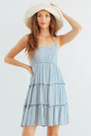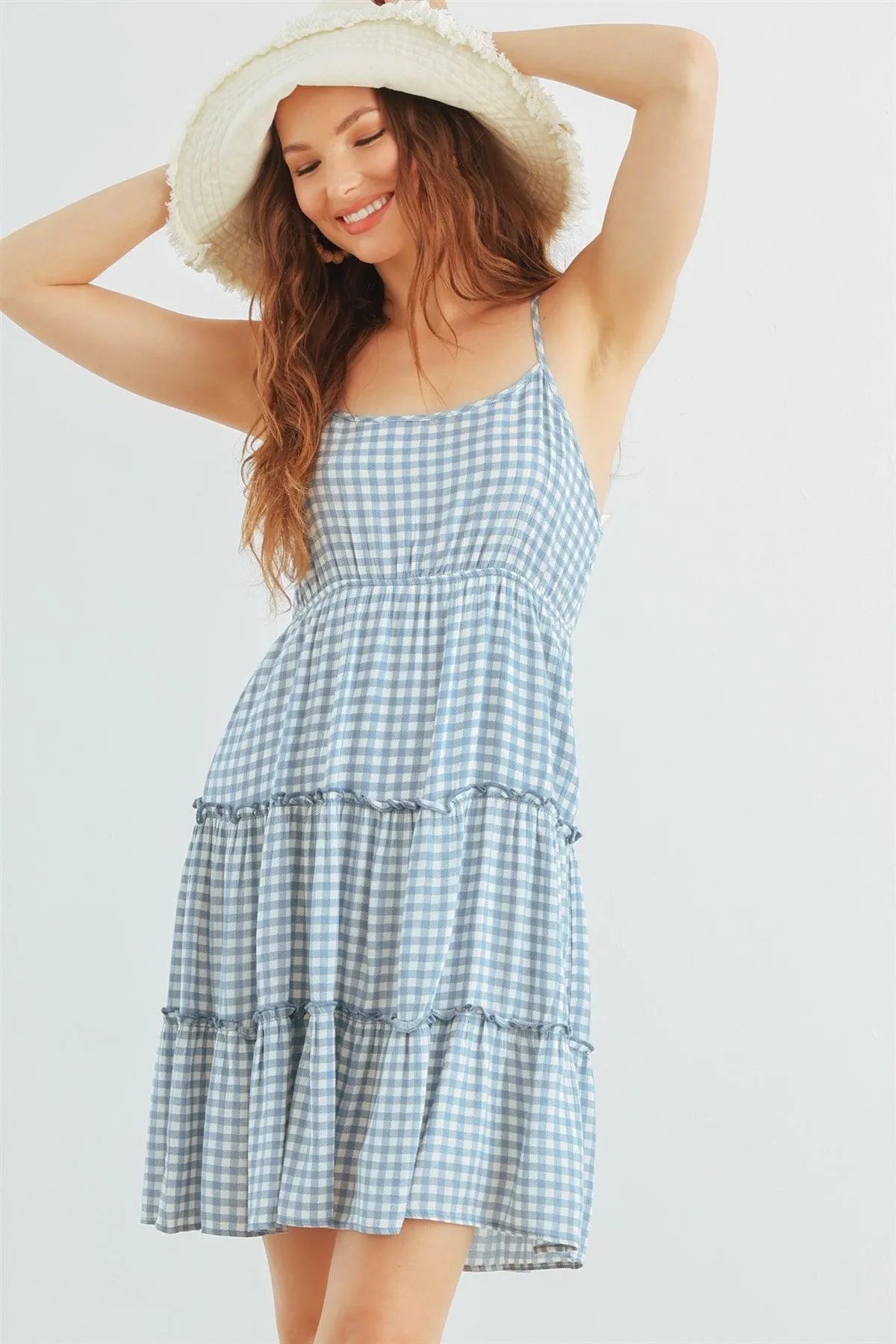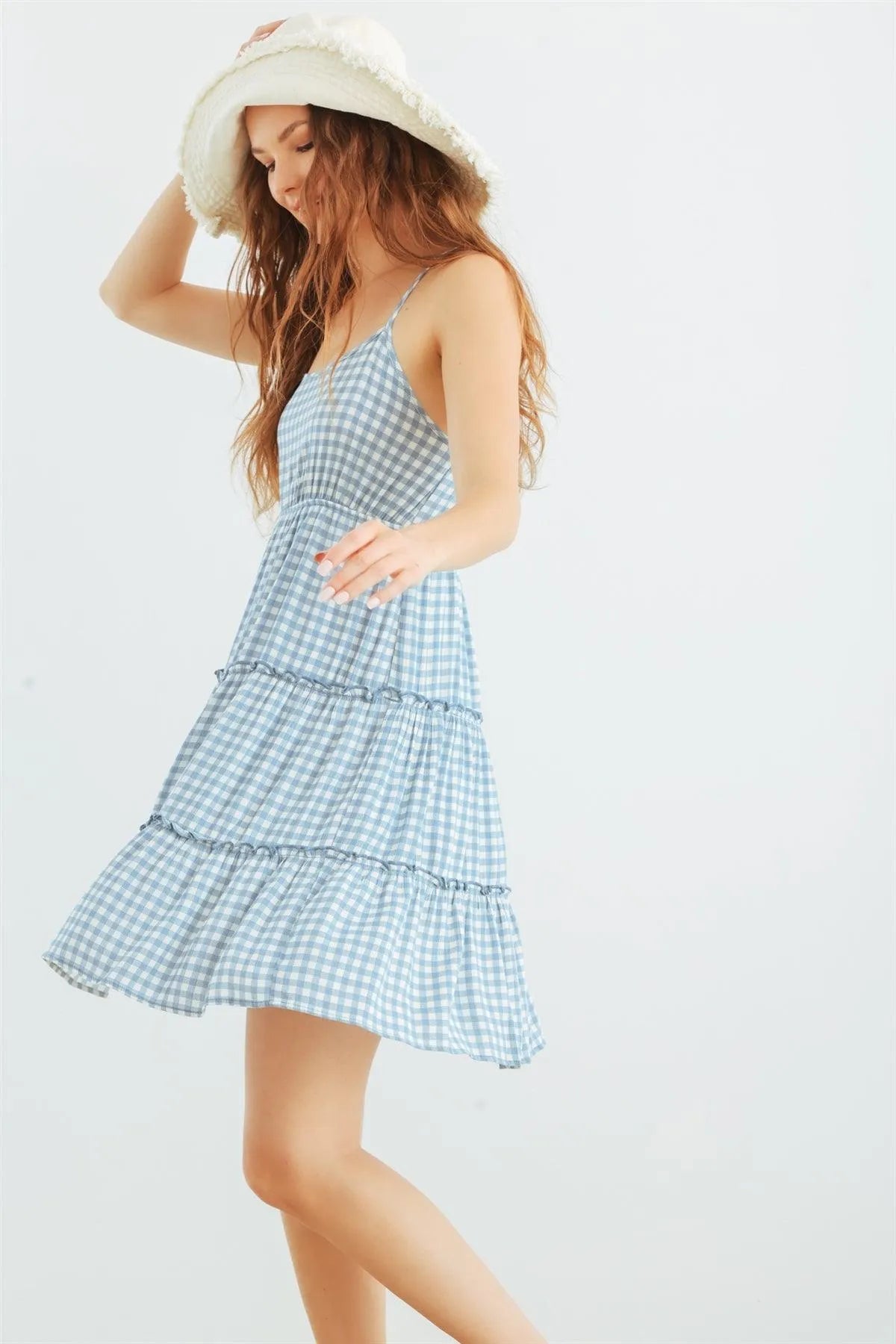 White & Blue Plaid Strappy Ruffle Mini Dress /2-2-2