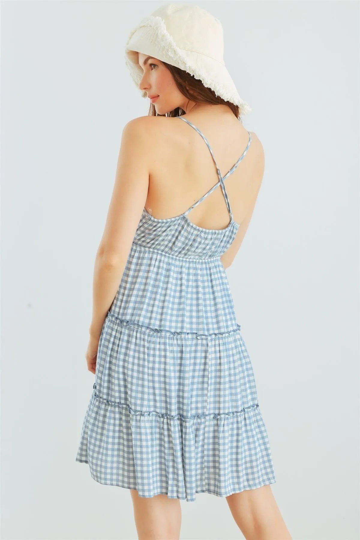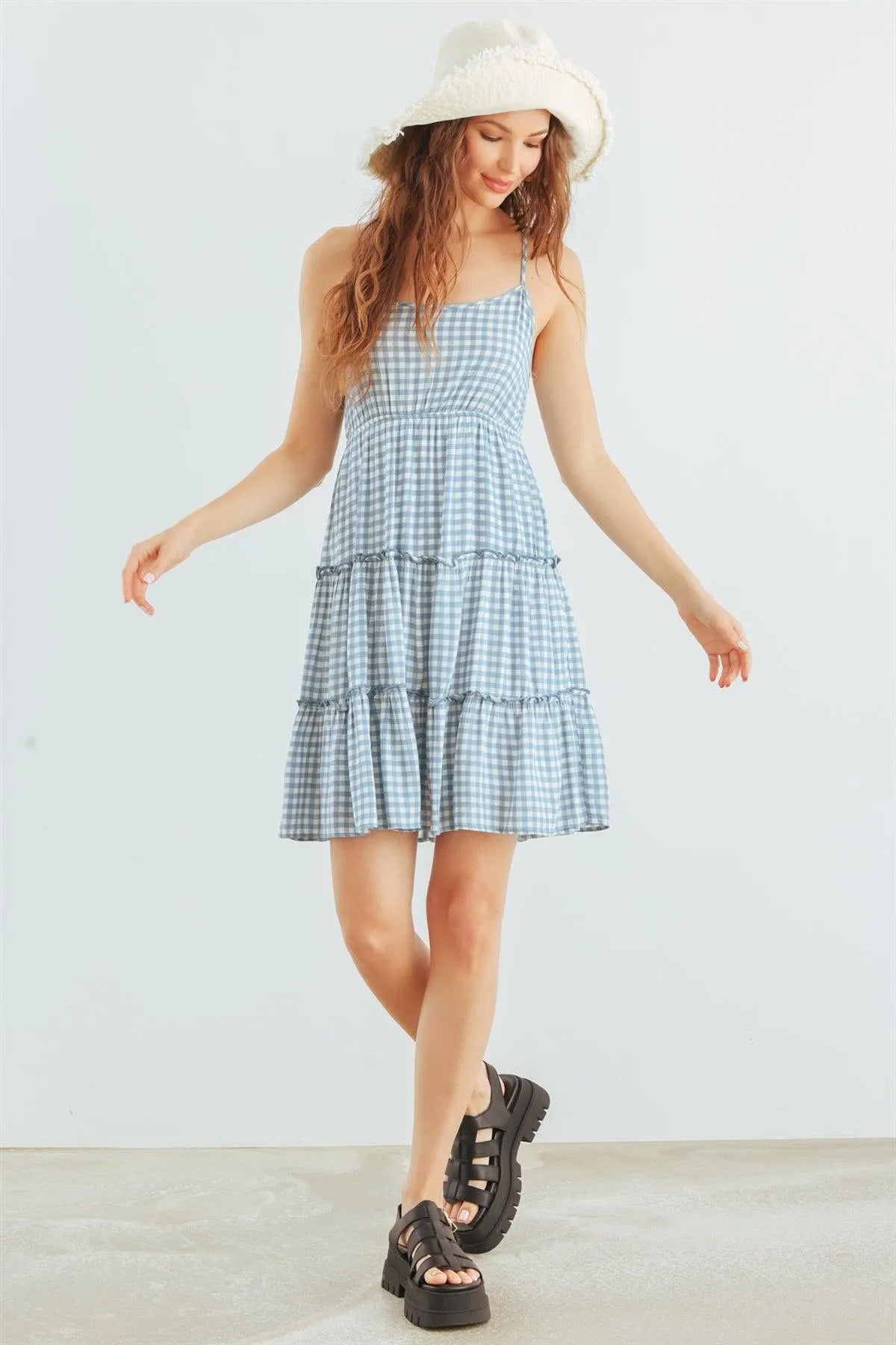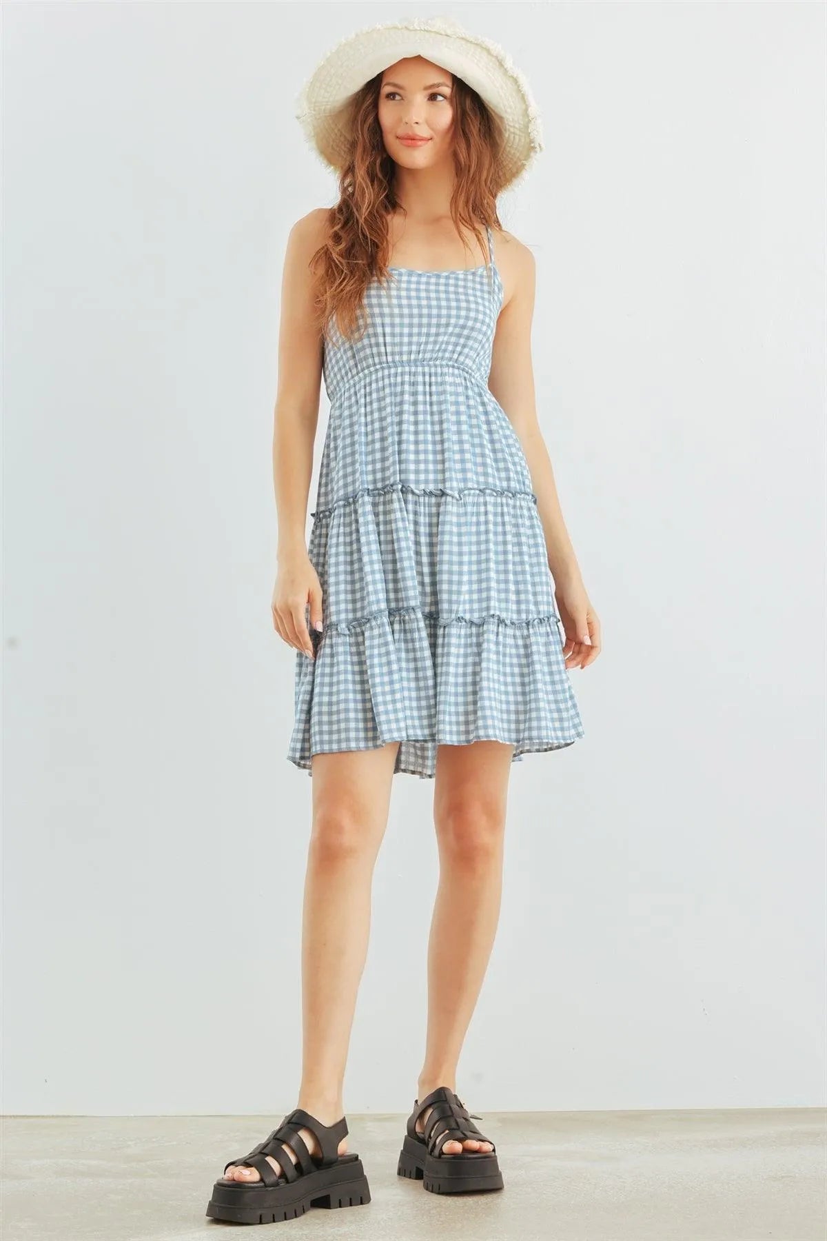 🖤 Item Features: White & blue, plaid print, sleeveless, adjustable straps, criss-cross back, ruffle, mini length, semi-stretchy, lined, cute, cool, girlish, stylish