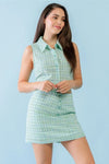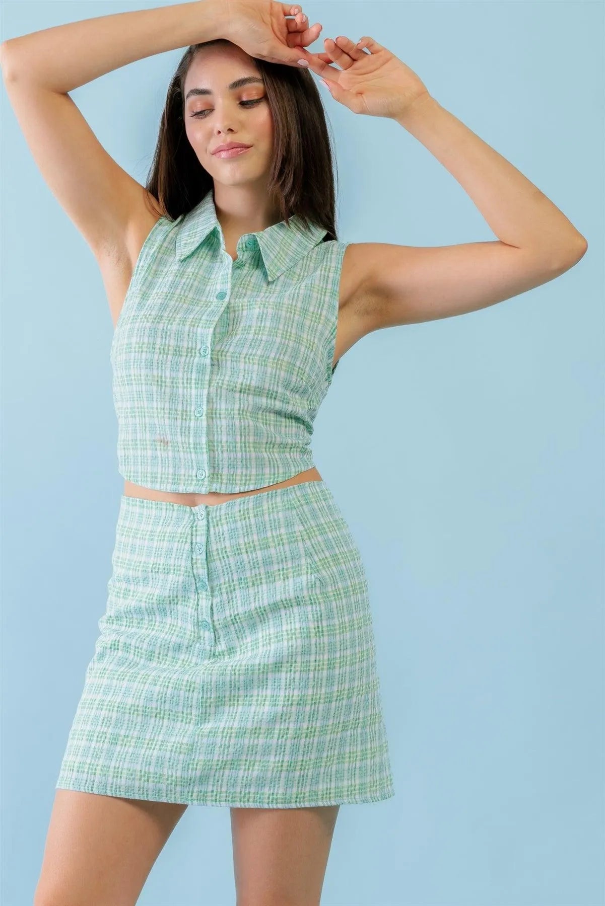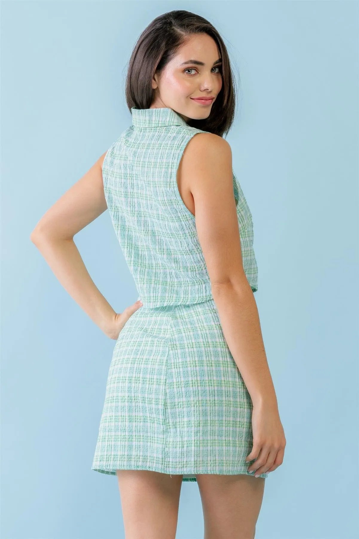 White & Blue Plaid Print Textured Collared Neck Sleeveless Button-Up Top & High Waist Button Mini Skirt Set /3-2-1