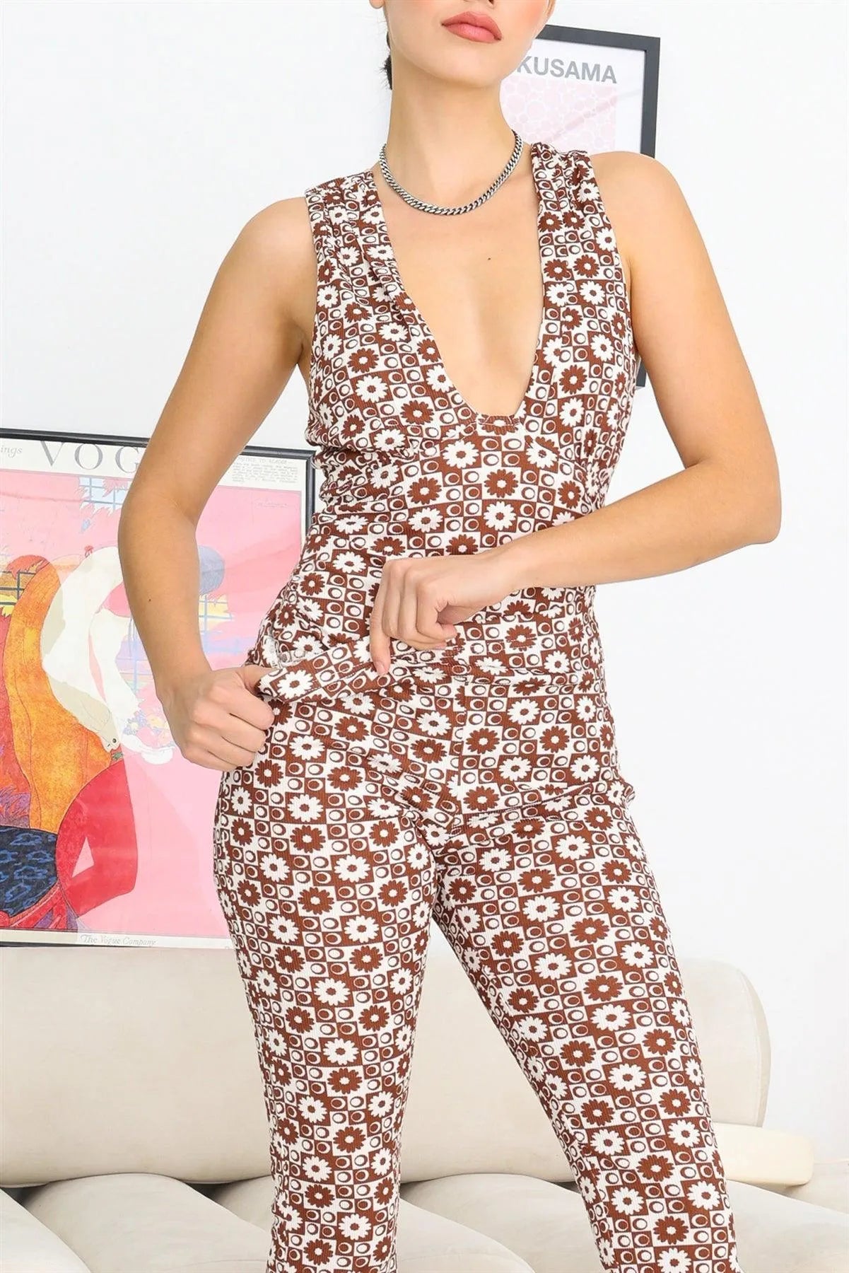 🖤 Item Features: White & brown, geometrical & flowers print, ribbed, u-neckline, thong double snap closure, sleeveless bodysuit, high waisted, slim fit pants, semi-stretchy, unlined, not see through, casual, cute, girlish, must-have, lifestyle.
