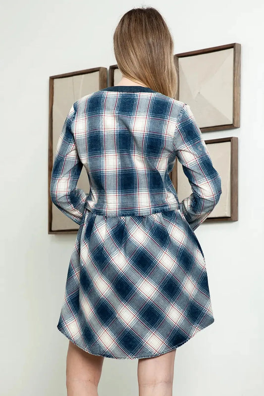 Houndstooth Print with Belt Cold Shoulder Long Sleeve Midi Shirt DressVendor:Reveuse