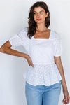 White Embroidered Balloon Short Sleeve Back Tie Top