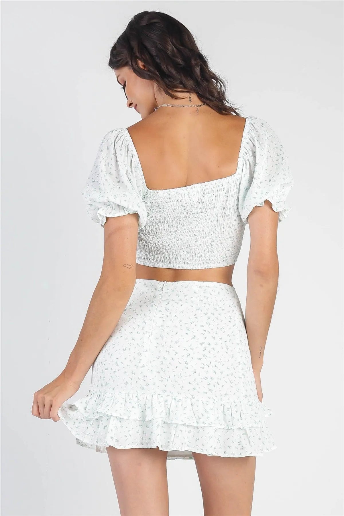 White Green Floral Smoked Short Sleeve Crop Top & High Waist Skirt Set /3-2-1