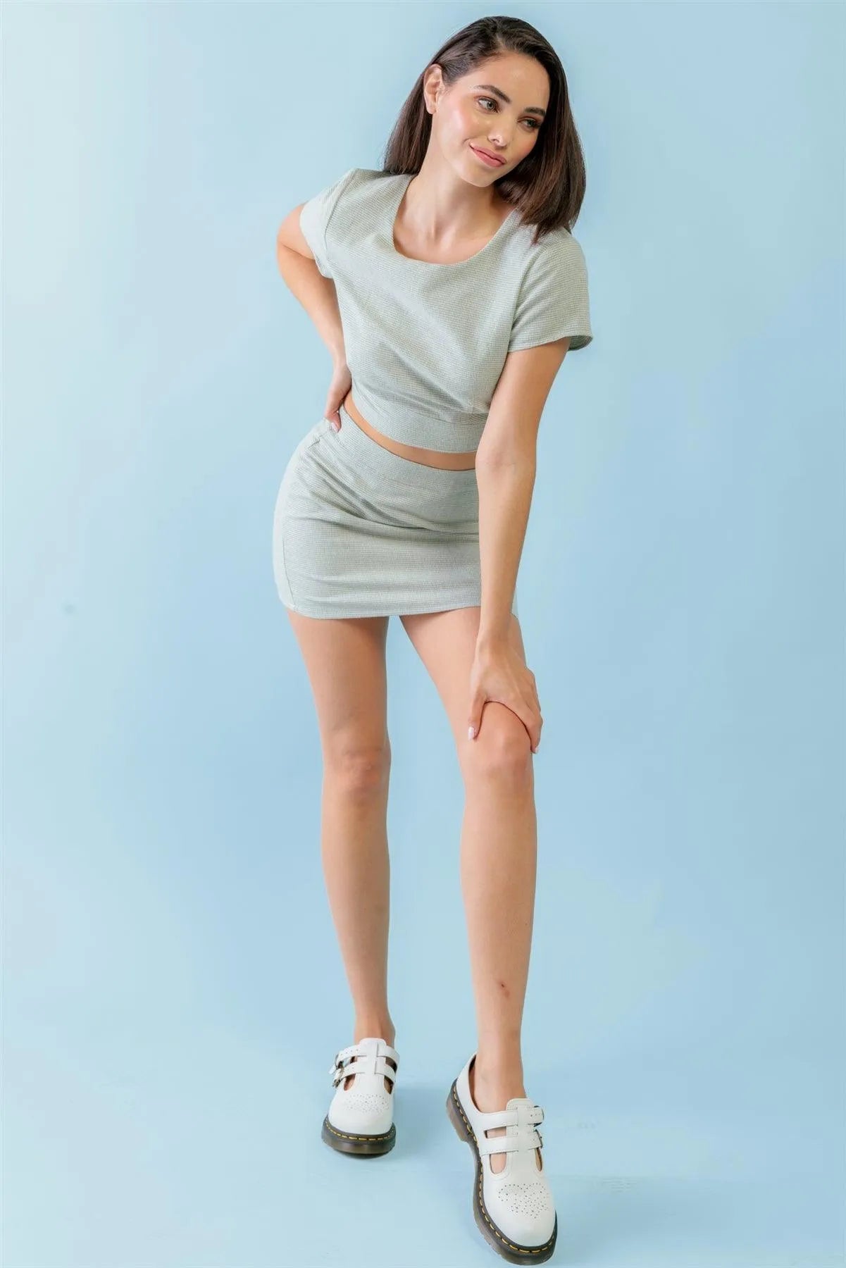 🖤 Item Features: Green & White, plaid print, cotton material, short sleeves, crew neckline, open back with button loop & self-tie closures, cropped length top, high waist, hidden zip-up closure, mini length skirt, non-stretchy, lined, not see through, casual, cute, lifestyle, must-have, girlish