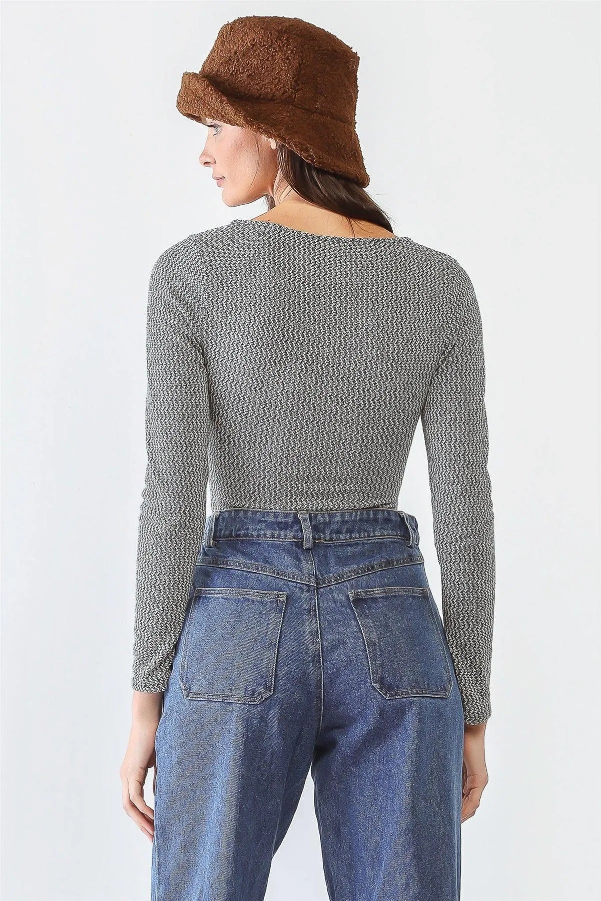 Women bodysuit: White & heather green, front cut-out details, thong double snap closure, long sleeves, round neckline, semi-stretchy, unlined, not see through, casual, cute, lifestyle