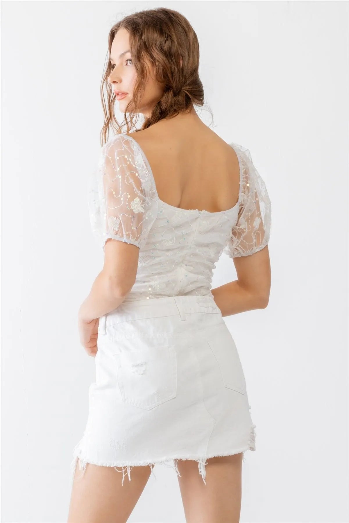 White Organza Mesh Sequin Embroidery Puff Short Sleeve Bodysuit /1-2-2-1