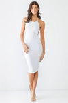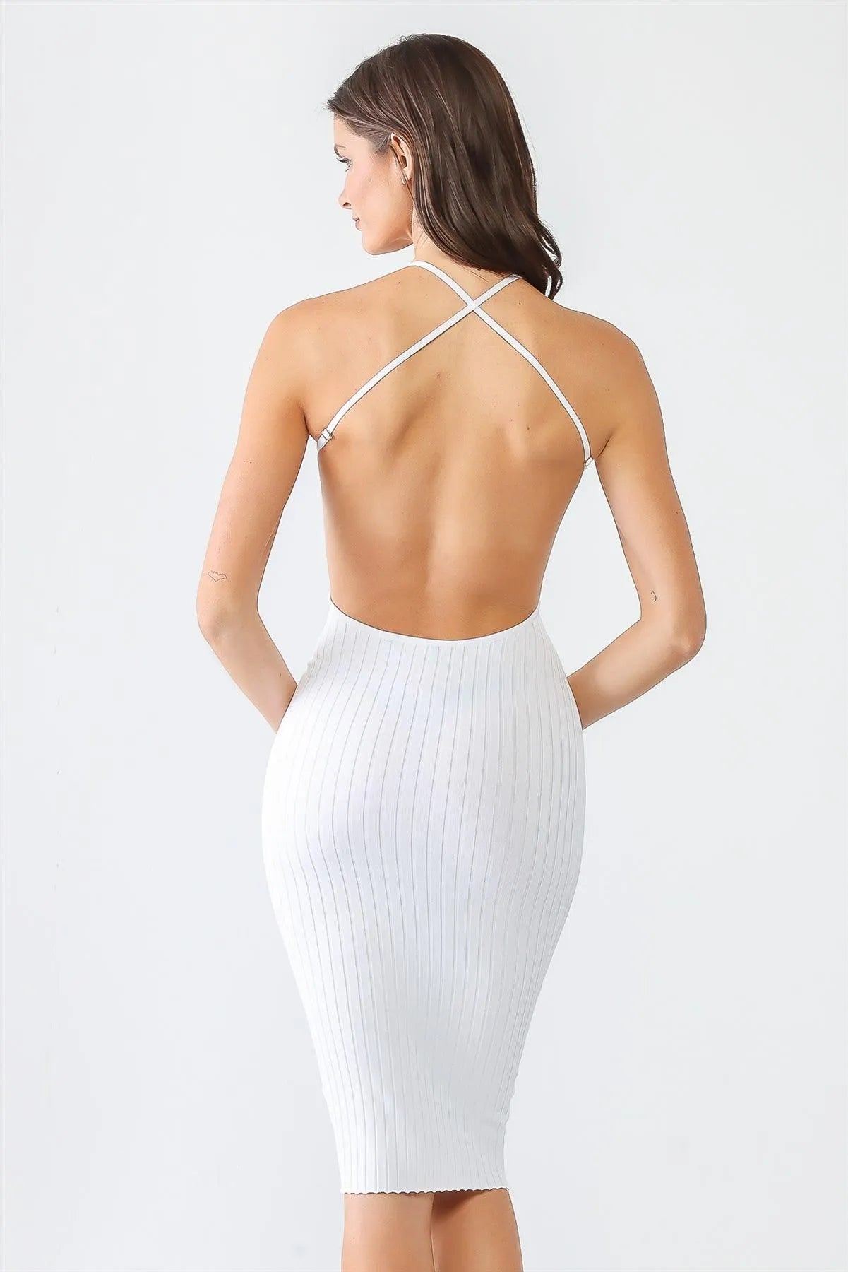 White Ribbed Halter Neck Sleeveless Criss-Cross Open Back Midi Dress /1-2-2-2-1