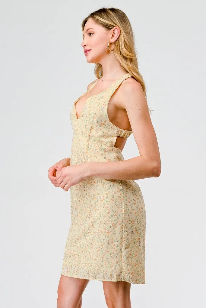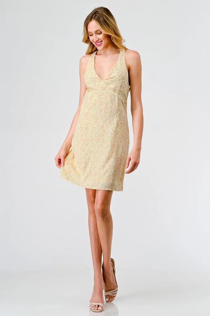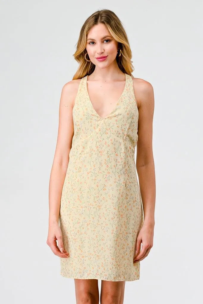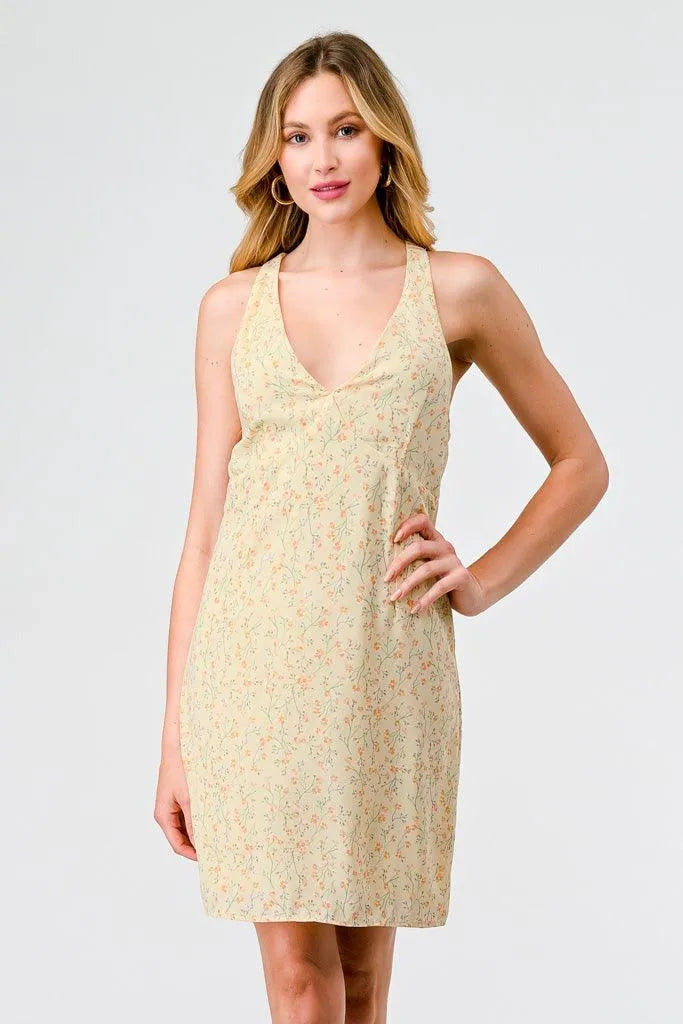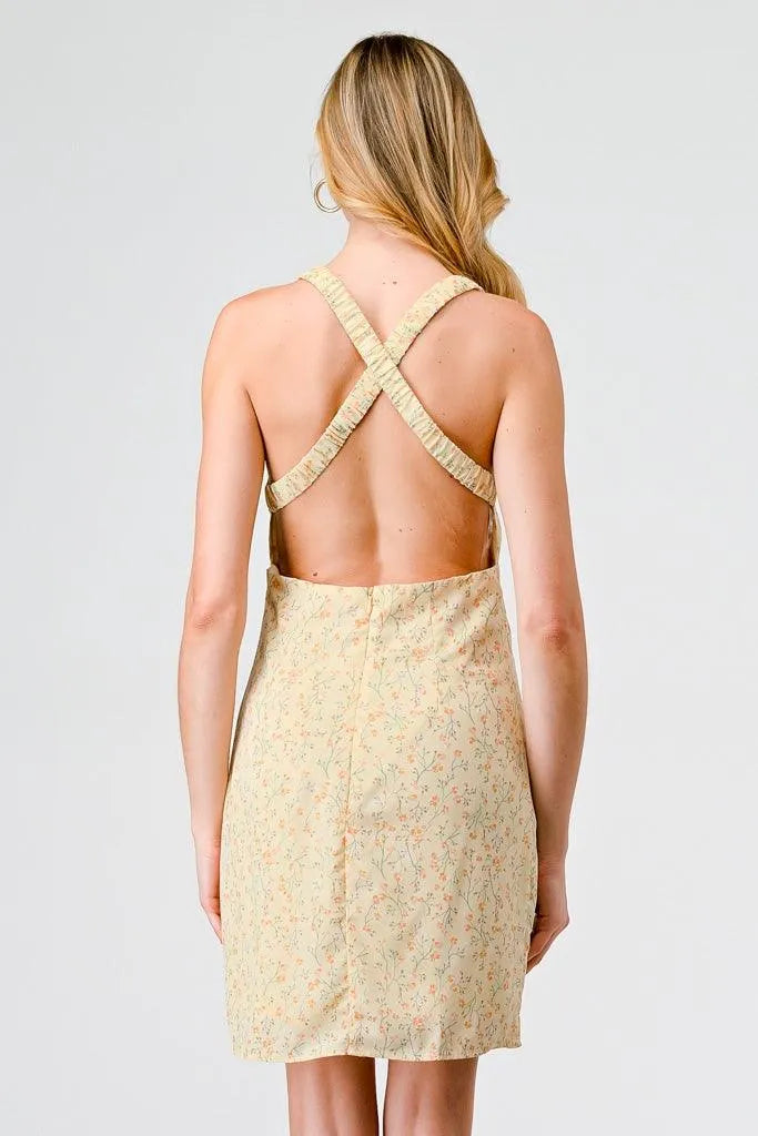 Yellow Floral Sleeveless V-Neck Criss-Cross Back Mini Dress /3-2-1