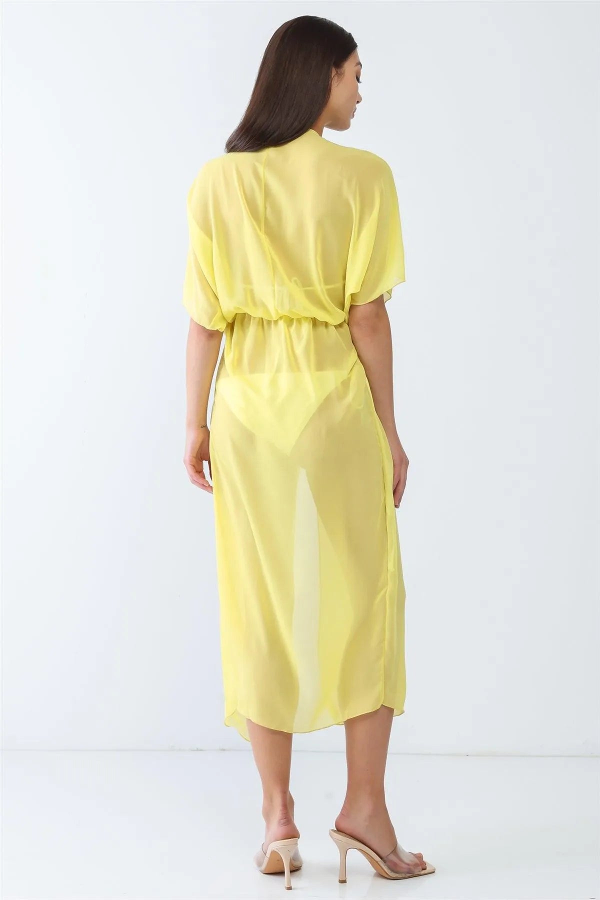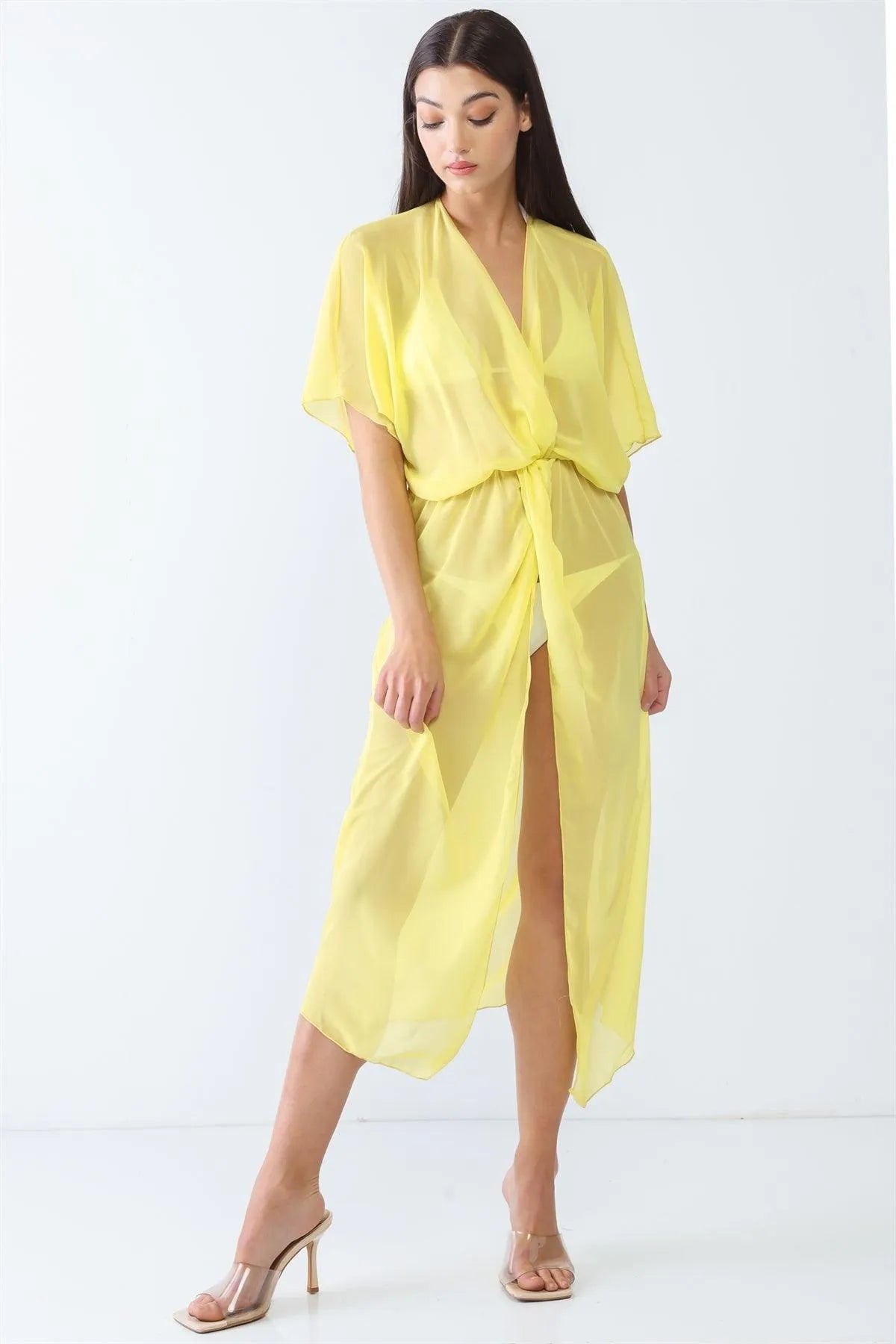 Yellow Mesh Twist V-Neck Dolman Short Sleeve Front Slit Kimono/Cover Up