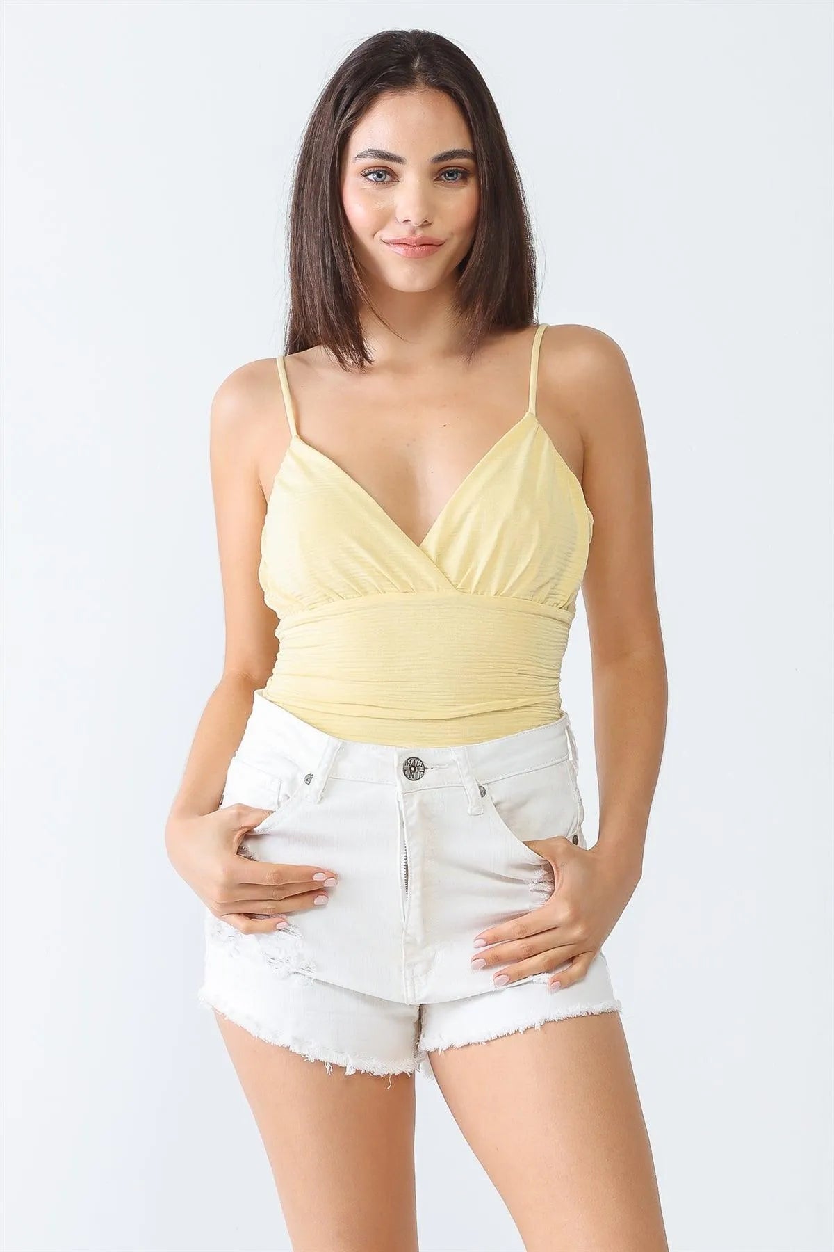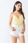 Yellow Ruched Textured Sleeveless Wrap V-Neck Bodysuit /3-1-1