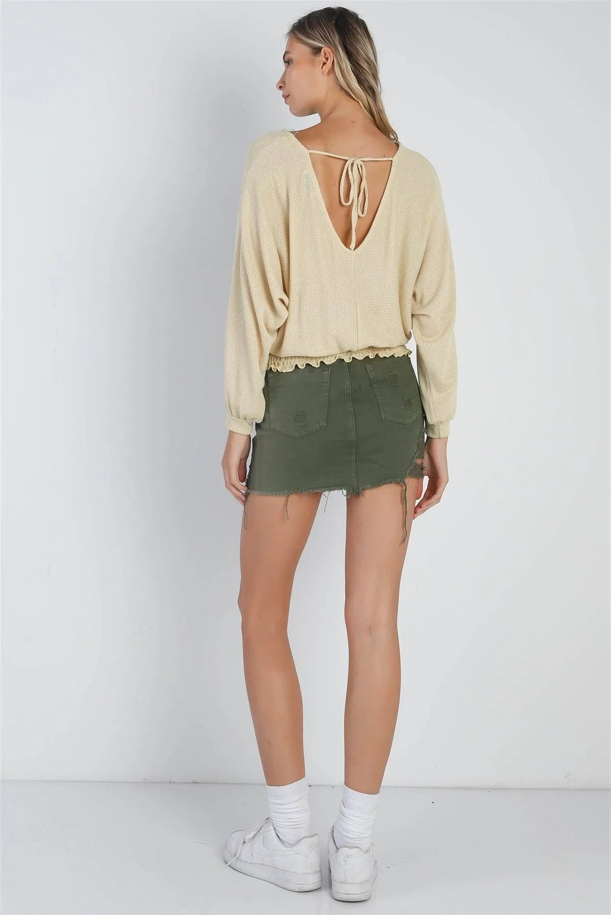 🖤 Item Features: Yellow, waffle knit, cuffed long sleeves, smocked hem with ruffle, crew neckline, back self-tie drawstring, casual, cute, girlish, chic, stylish, lifestyle, trendy