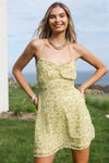 🖤 Item Features: Yellow & white, floral print, ruffle details, strappy, sleeveless, elasticized waistband, mini length, lined, non-stretchy, non-sheer, cute, girlish, floral look, trendy, must-have, bright