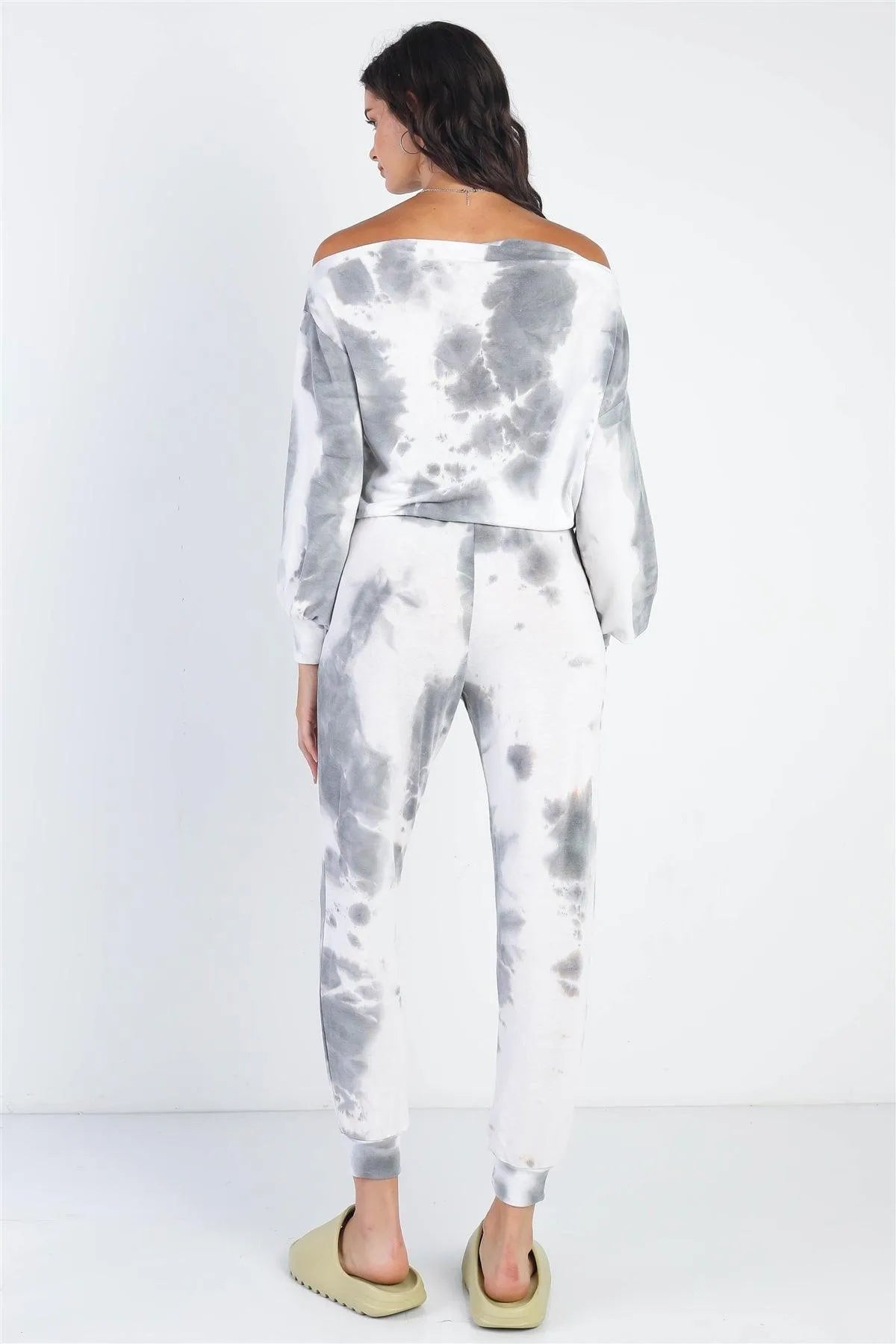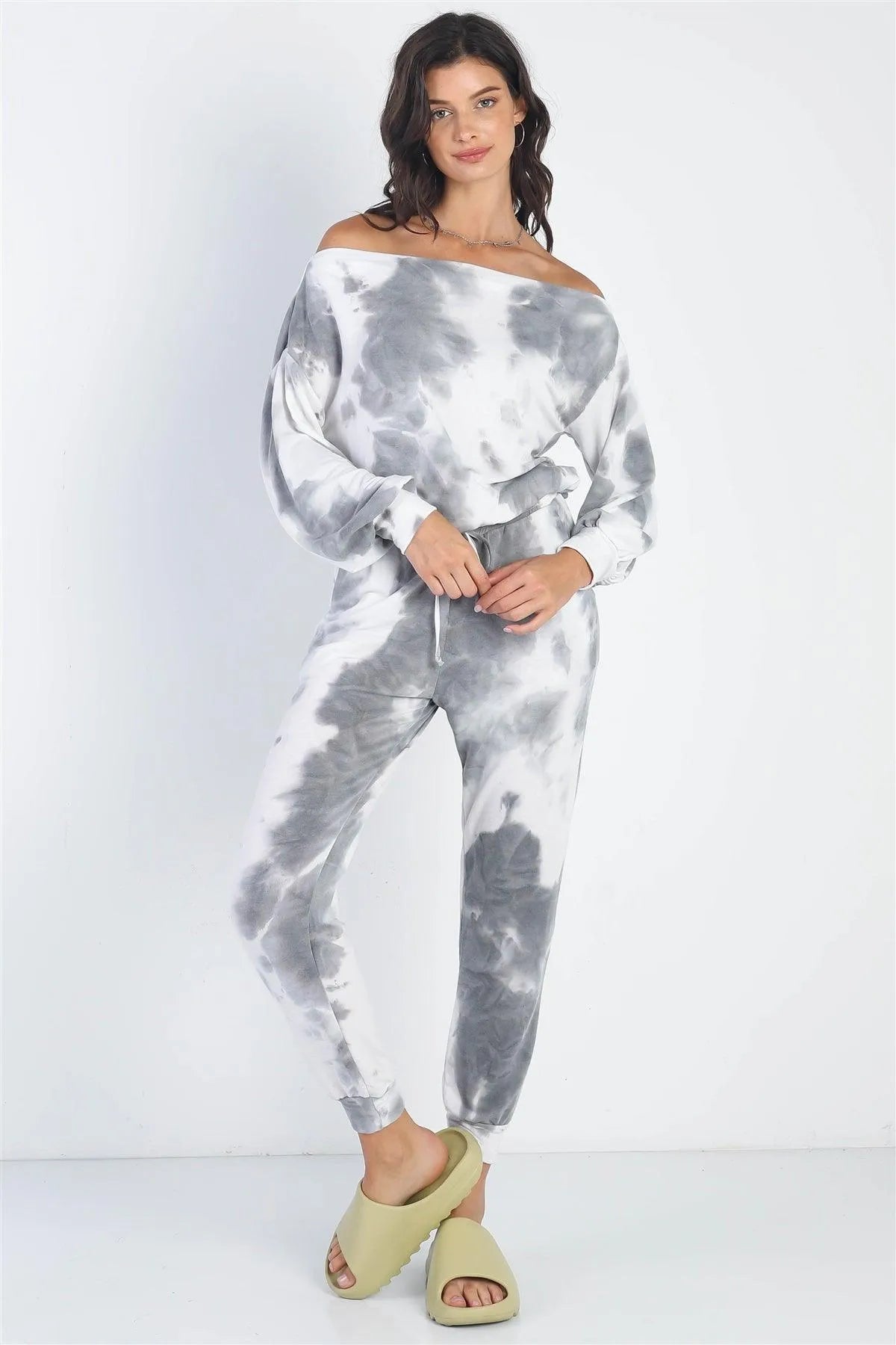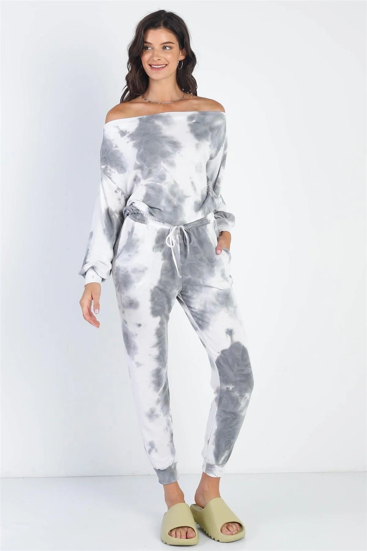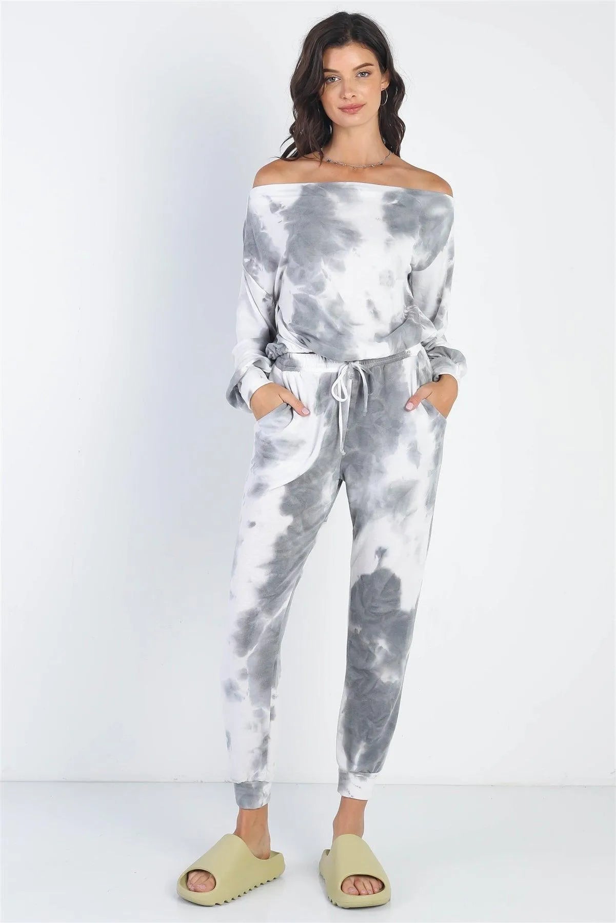 Charcoal Tie-Dye Off-The-Shoulder Top High Waist Pants Set