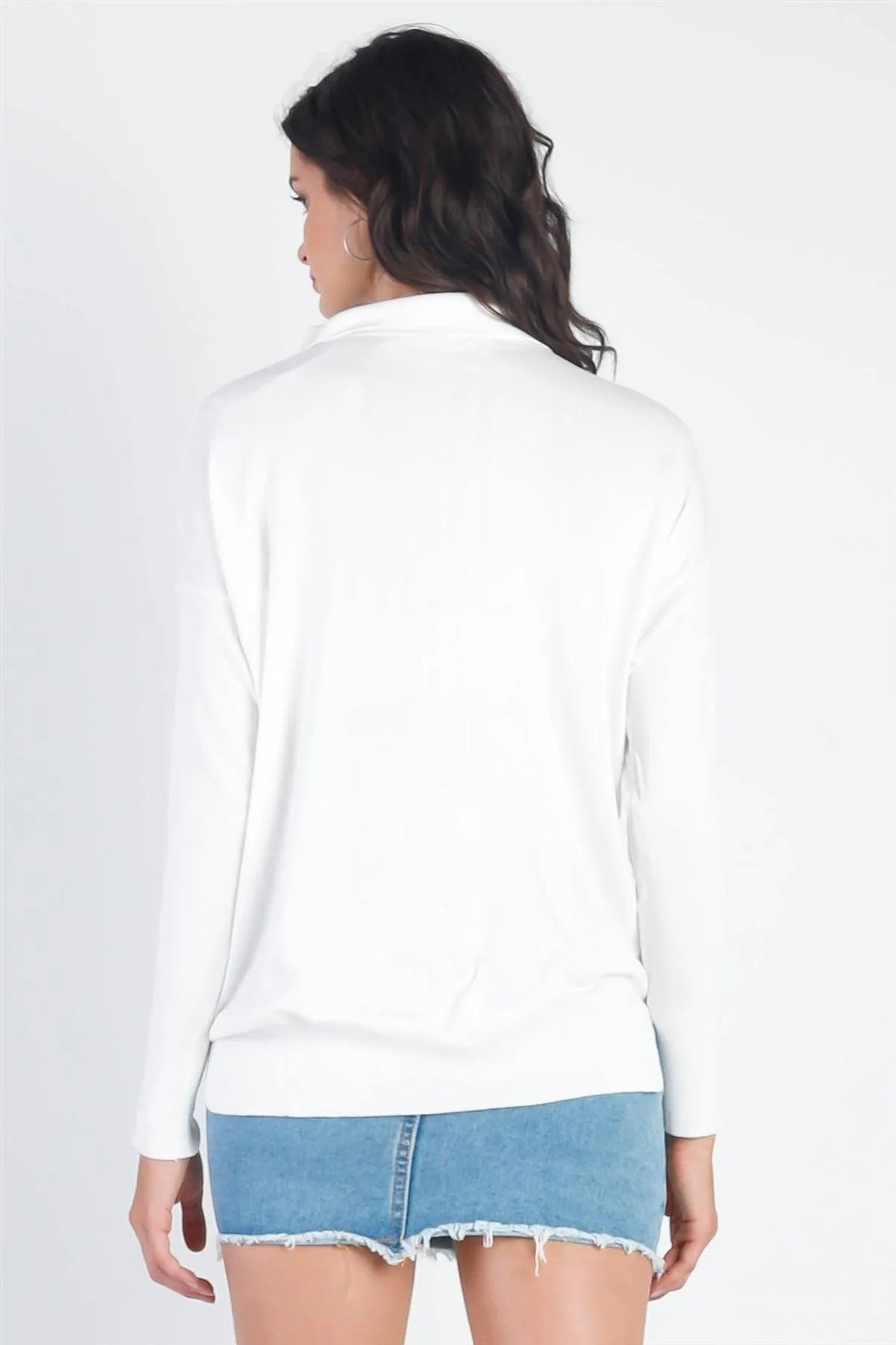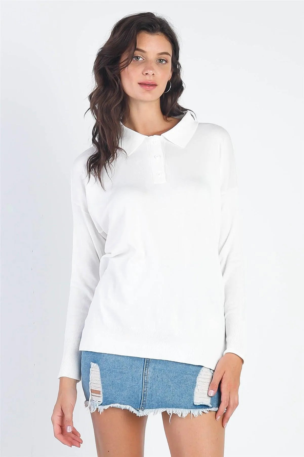 🖤 Stay cozy and stylish with our white Button Up Collar Neck Long Sleeve Sweater. Perfect for chilly days, this sweater features a button up collar for added style and warmth. Say goodbye to boring winter fashion and hello to our versatile and playful design!