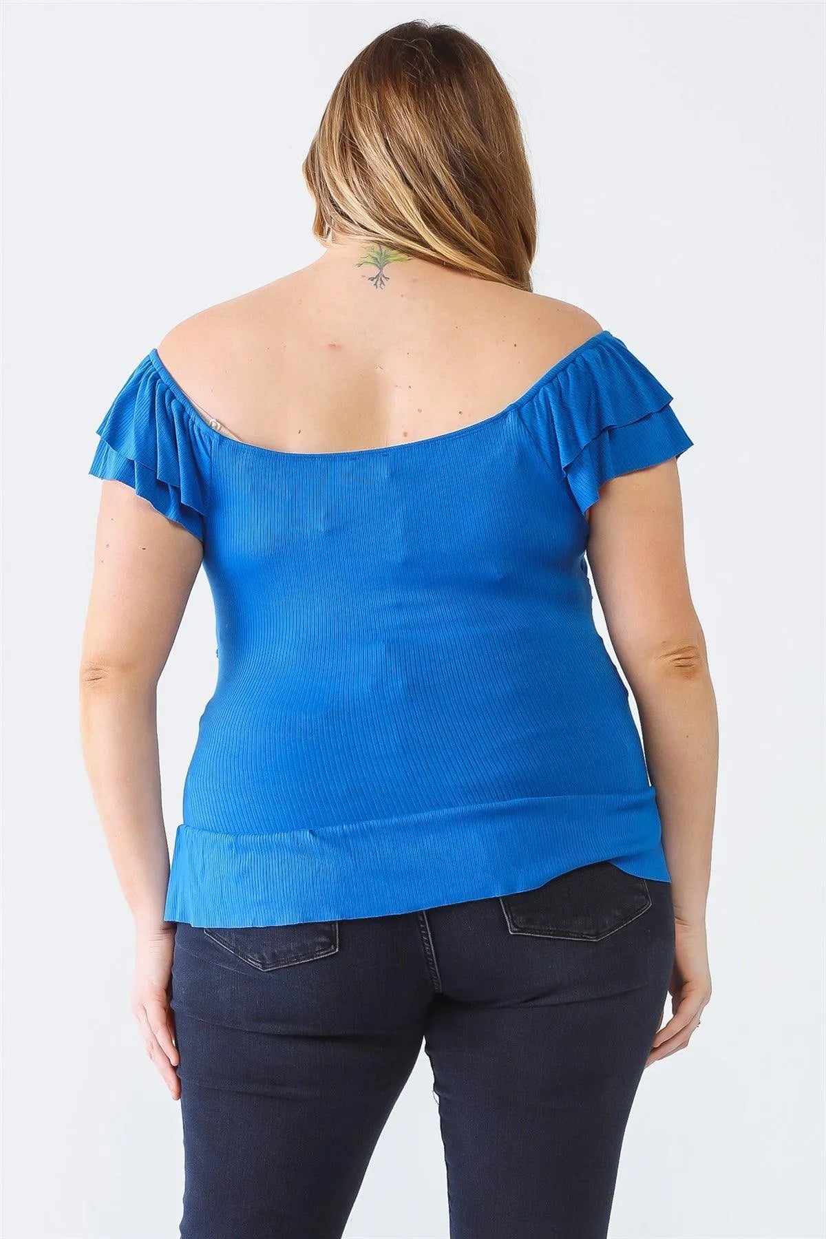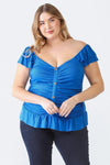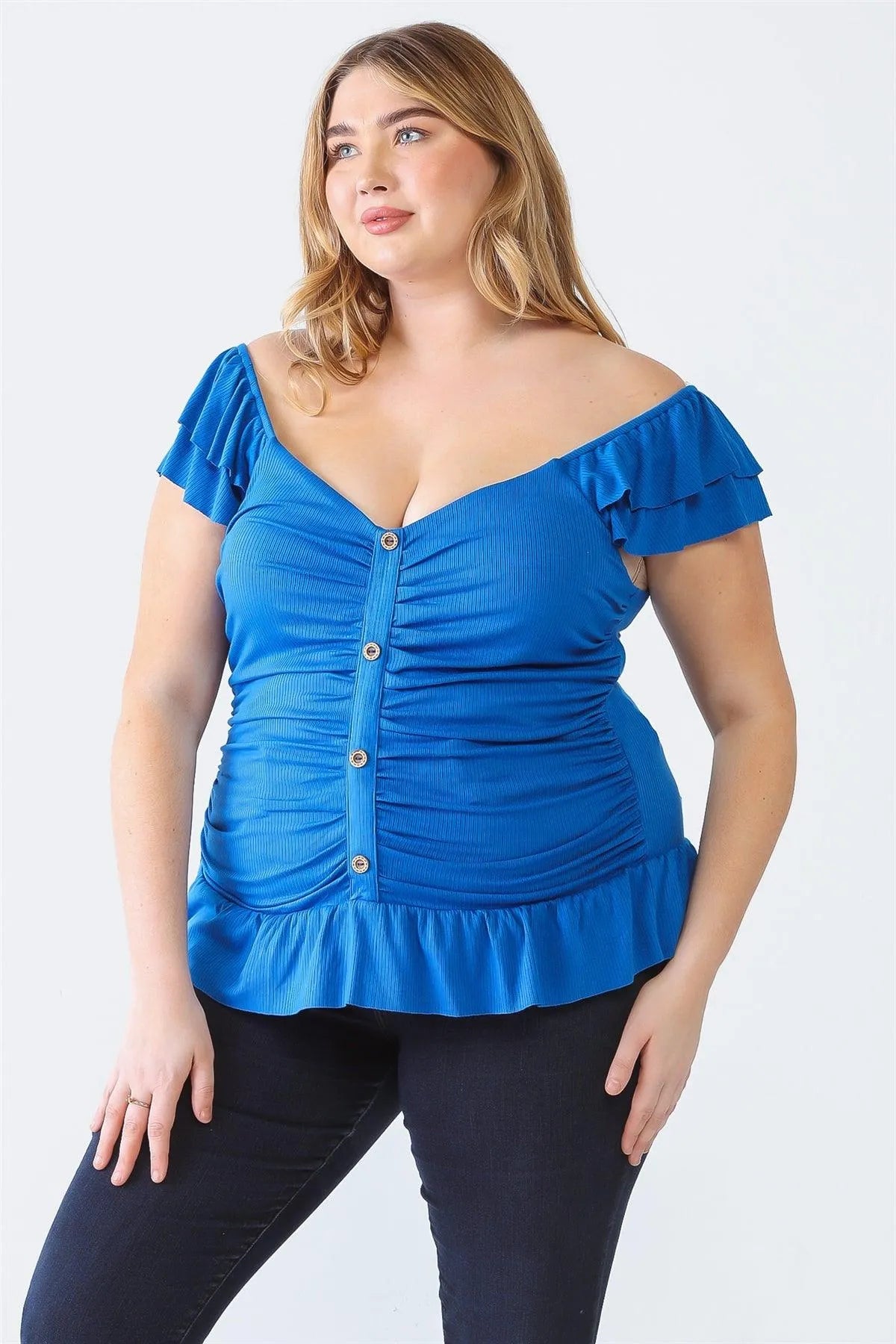 Junior Plus Blue Ribbed Button-Up Ruffle Short Sleeve Top /1-1-1