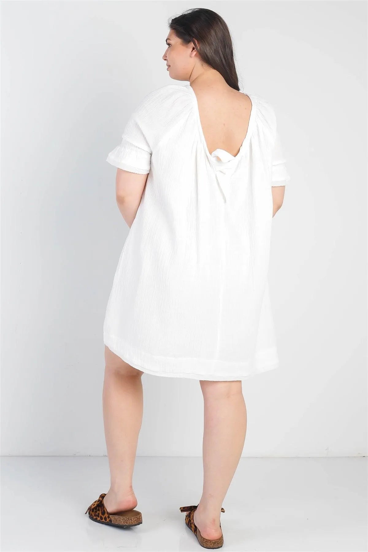 Junior Plus White Textured Crew Neck Two Pocket Trim Hem Dress /1-2