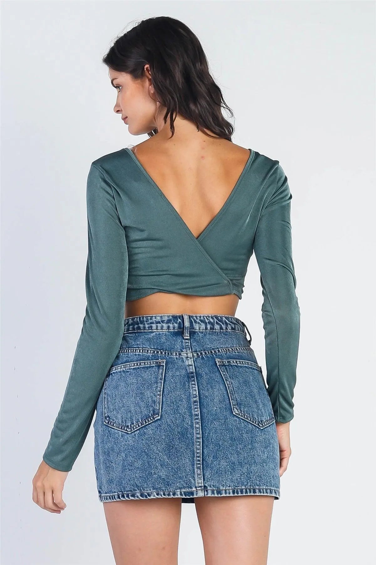 🖤 Item Features: Teal, satin effect, bust self-tie detail, long sleeves, wrap back, cropped length, slim fit, stretchy, unlined, not see through, cute, girlish, trendy, stylish, street style, eye-catching