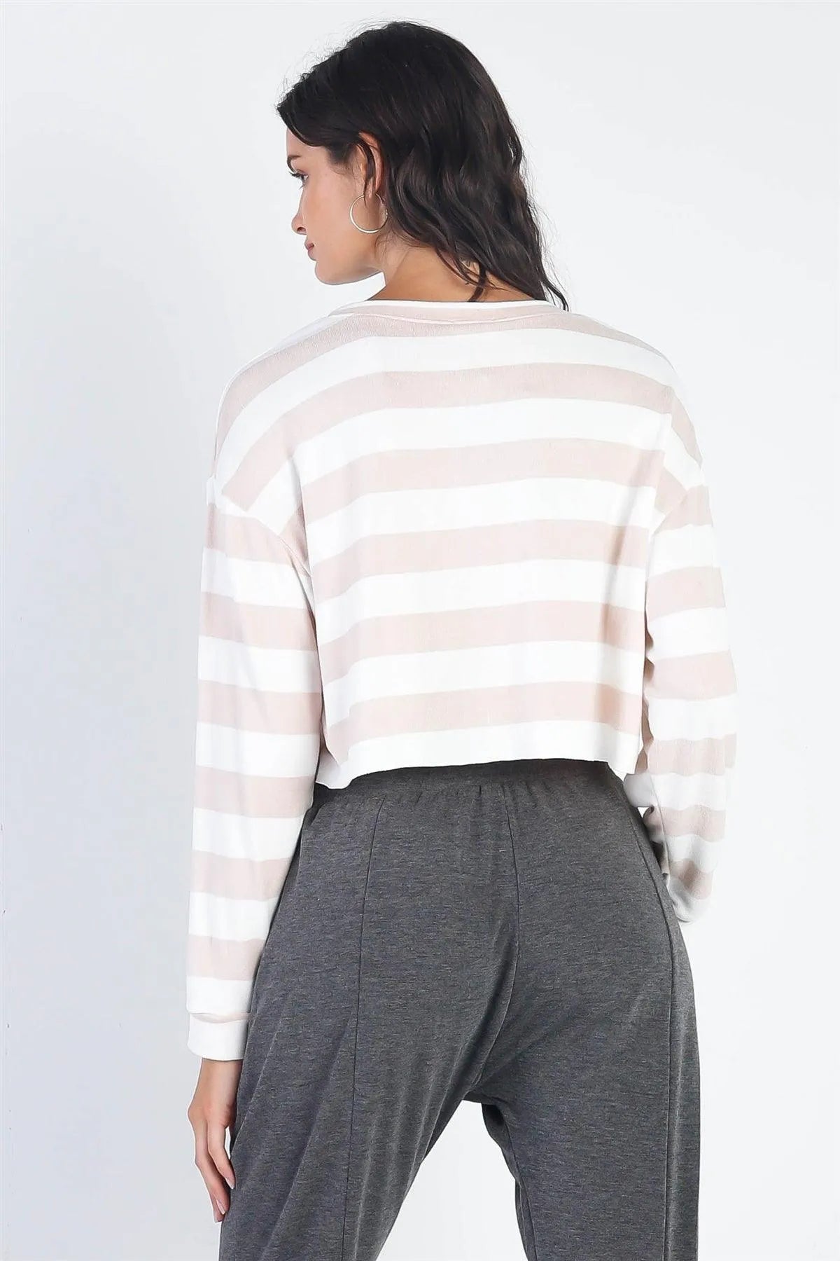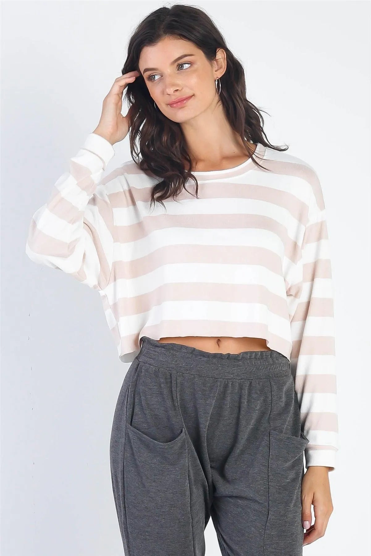 White & Taupe Stripe Long Sleeve Crop Top /3-2-1