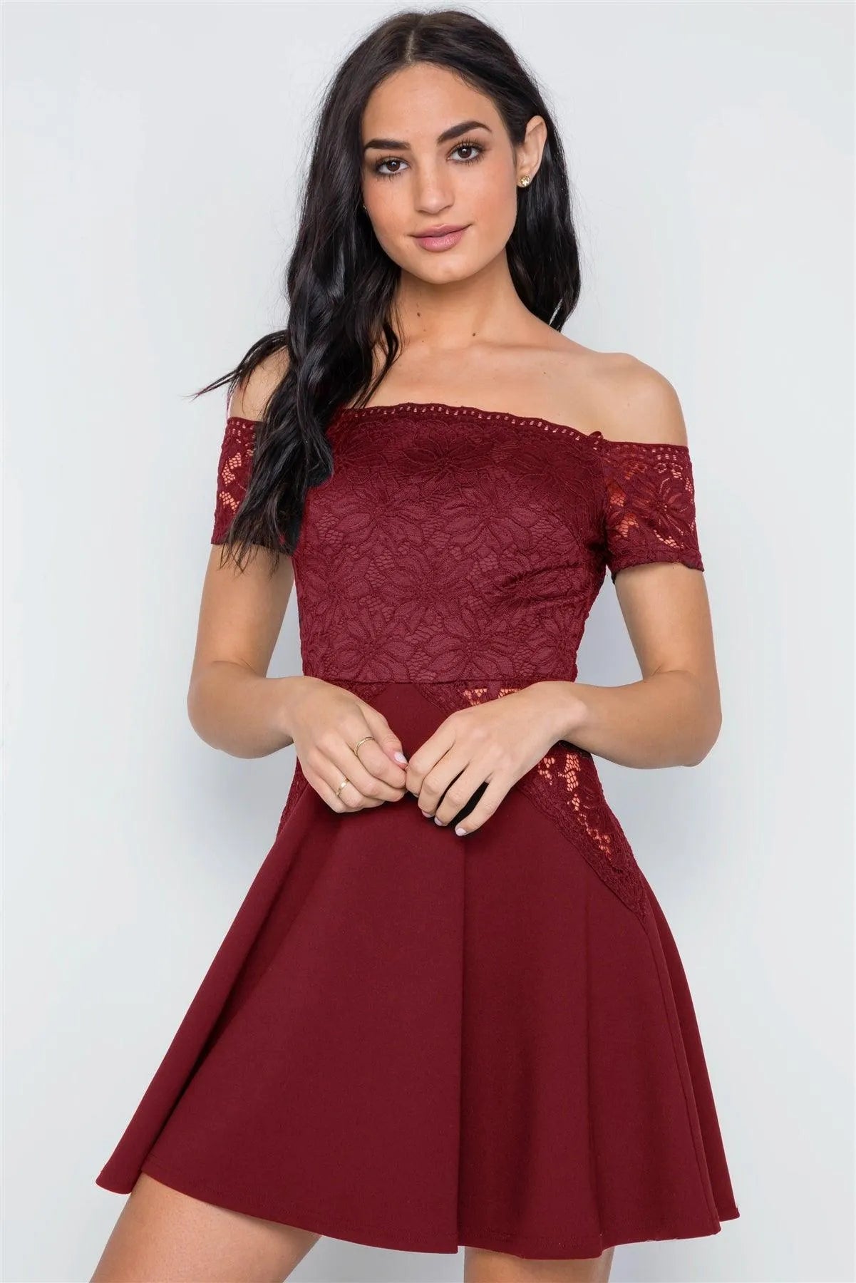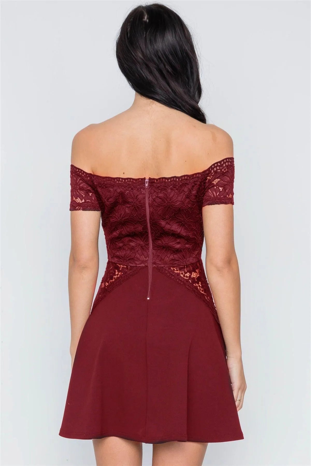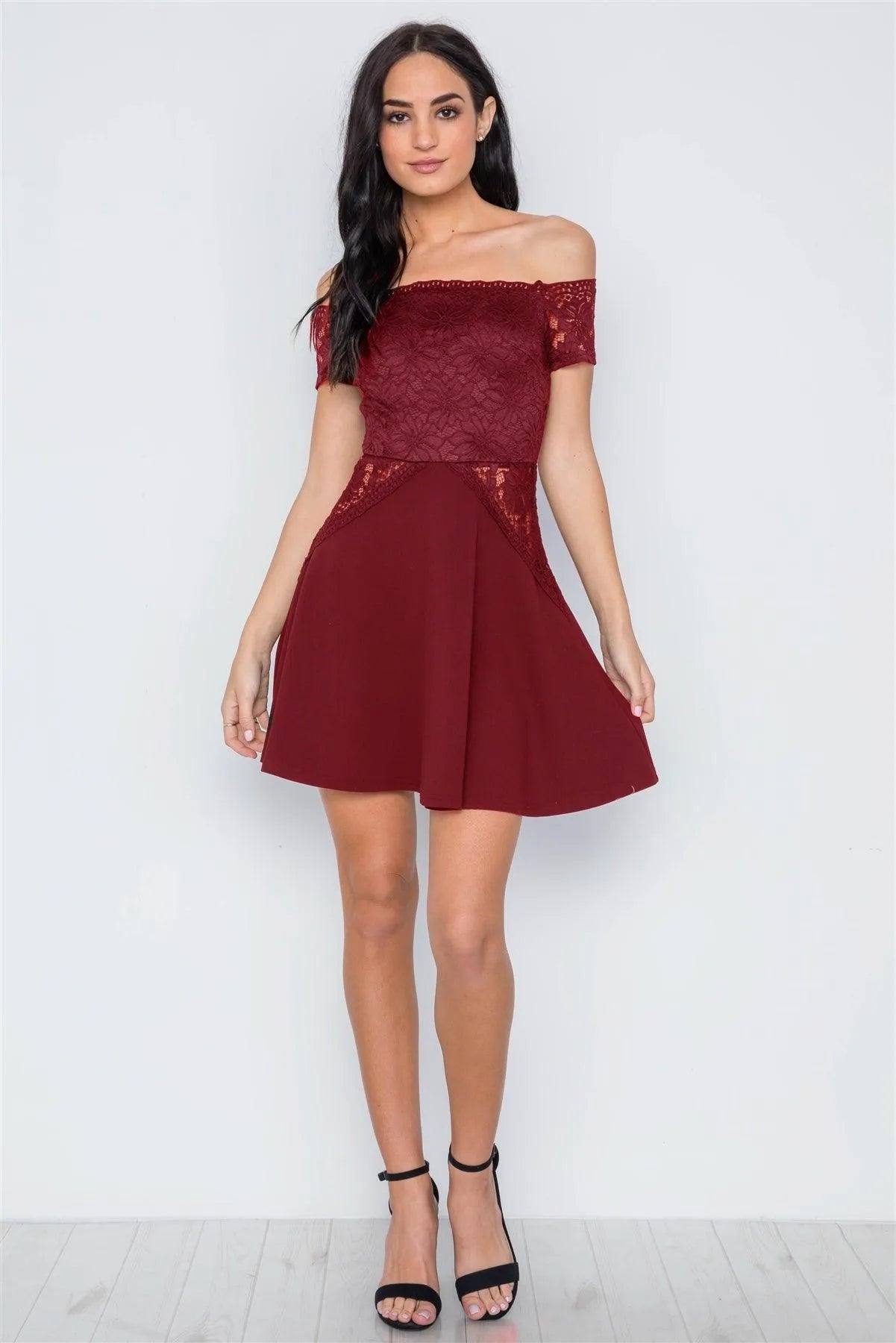 Wine Floral Lace Off-The-Shoulder Skater Mini Dress /2-2-2