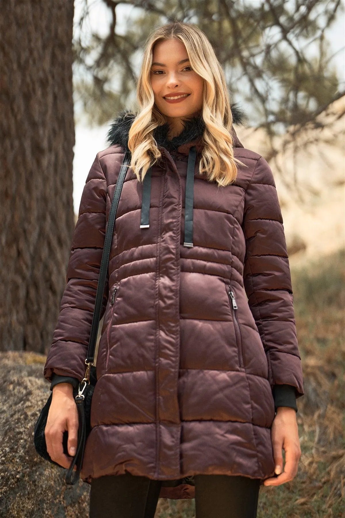 Wine Glossy Long Fitted Vegan Fur Hood Detail Winter Puffer Jacket /1-2-2-2