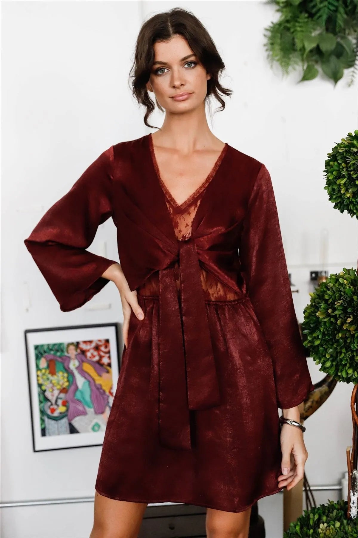Wine Satin Effect Lace Bodice Detail Self-Tie Front Kimono Sleeve Mini Dress /1-2-2-1