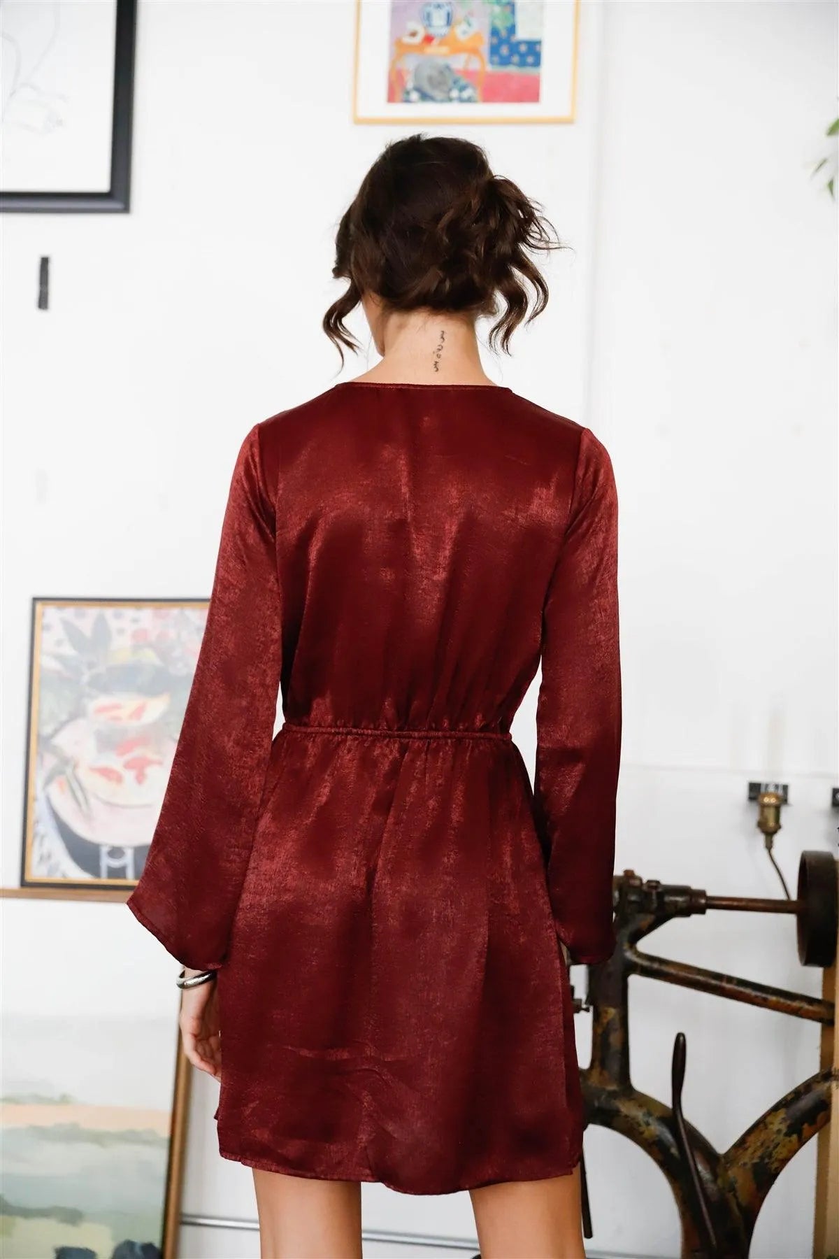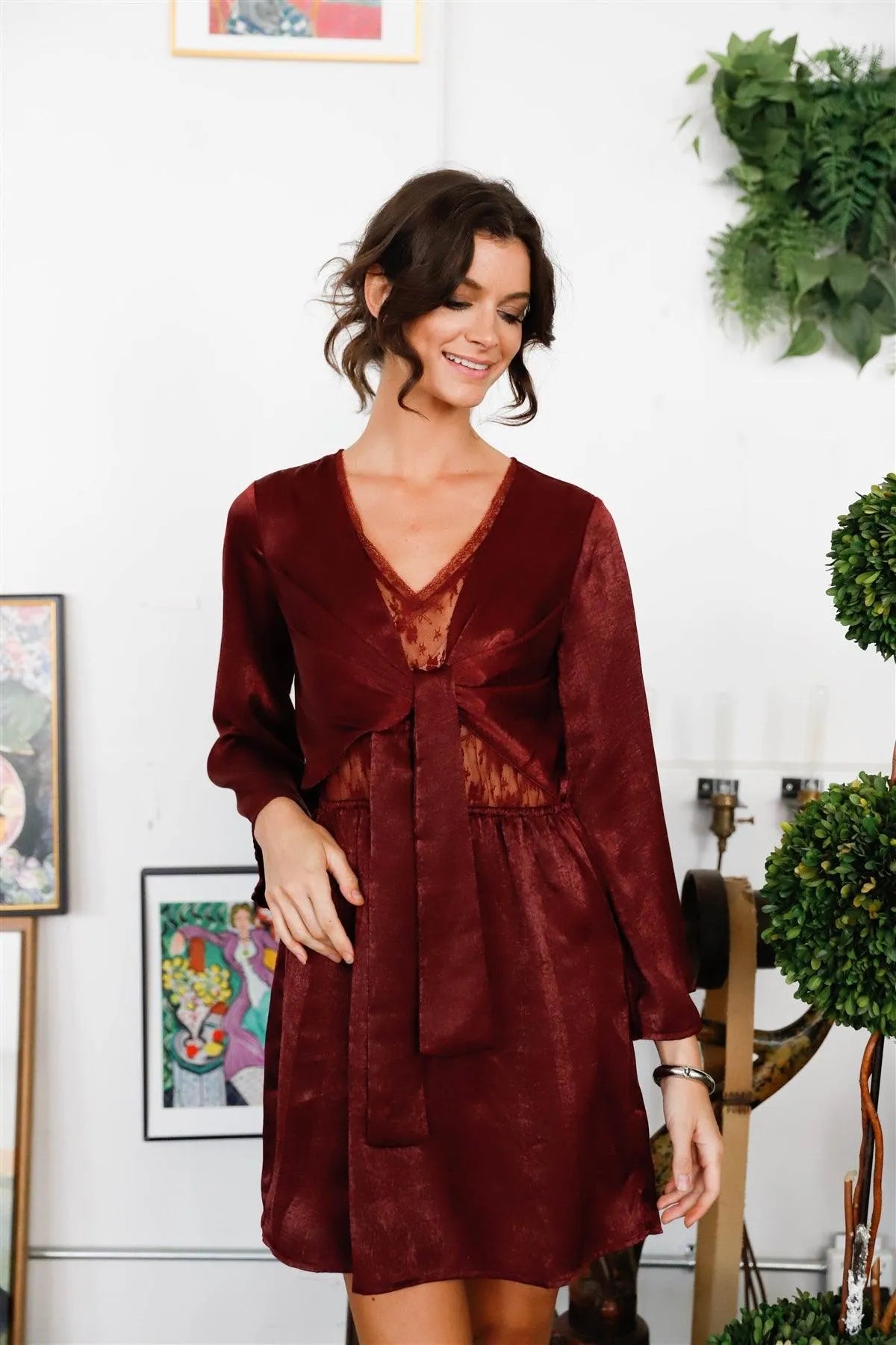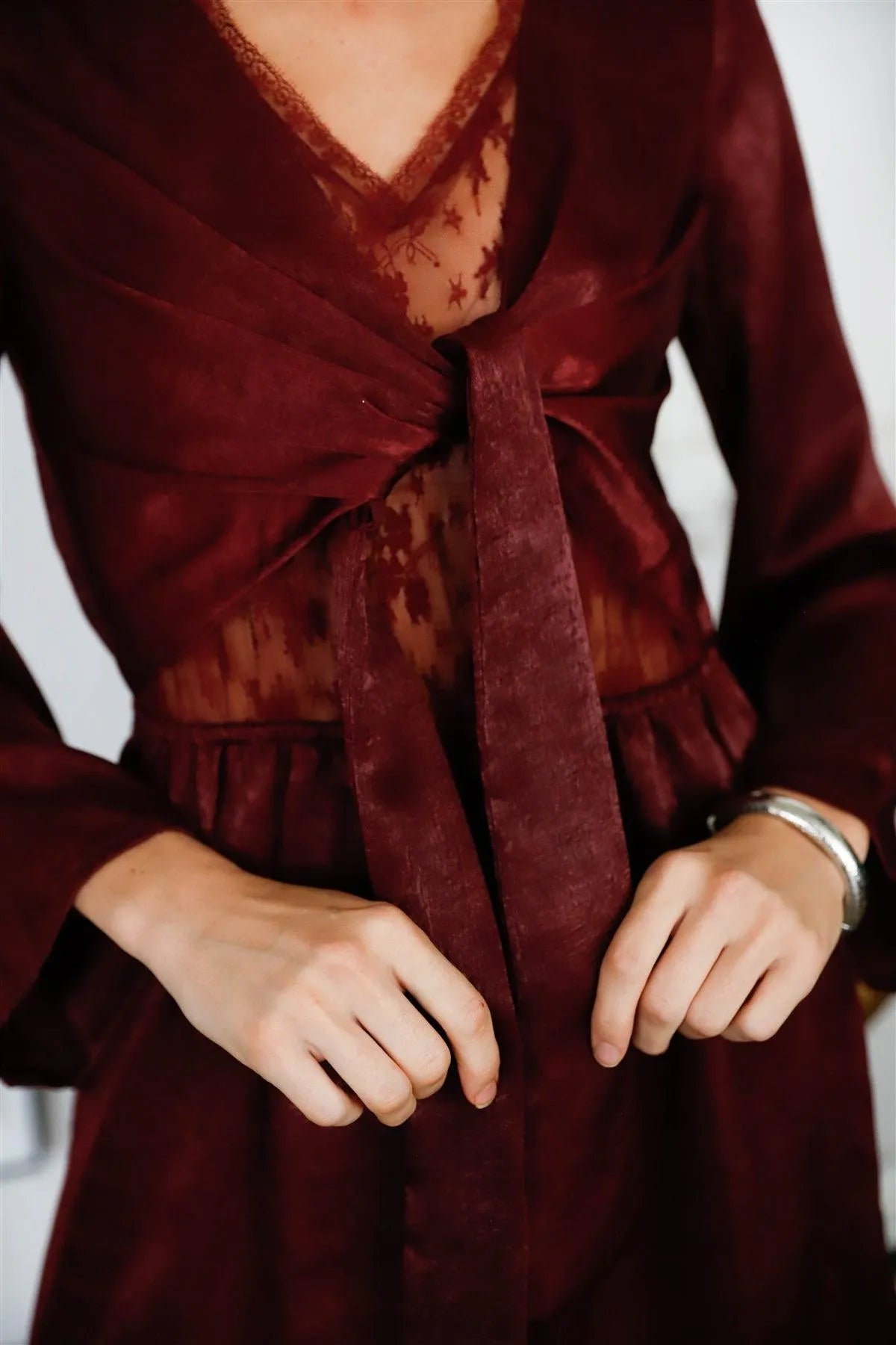 🖤 Item features: Wine, solid color, satin effect material, lace bodice detail, elasticized waistline, self-tie front, v-neckline, long kimono sleeves, relaxed fit, mini length, unlined, partially sheer, non-stretchy, elegant, chic, cute, casual